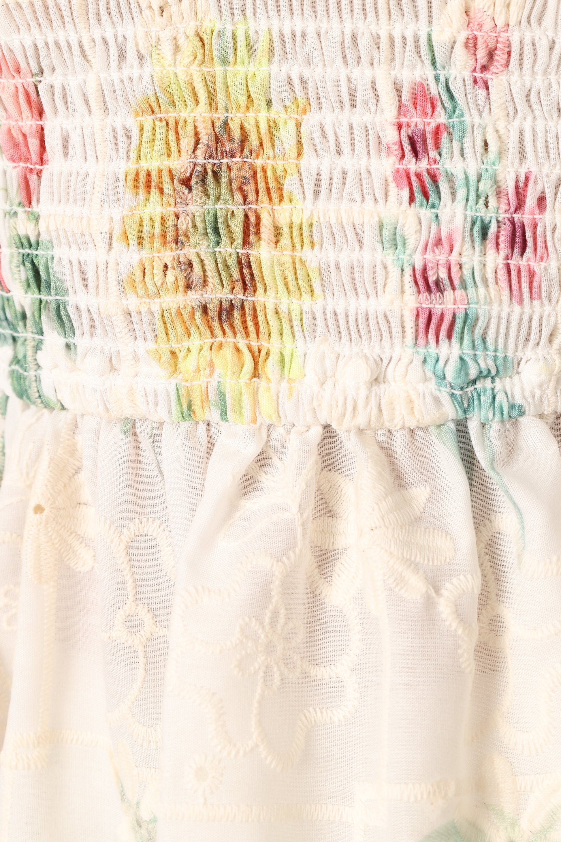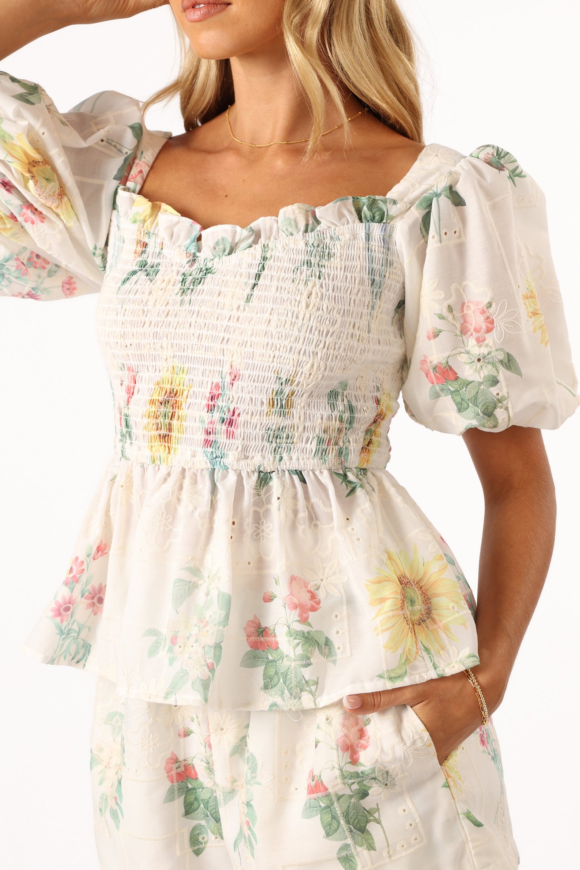 DETAILS This peplum style top, with its square neckline and short puff sleeves, is all you need to make a style statement. The elasticised shirred bodice ensures a comfortable fit, while the peplum ruffle hemline adds a playful touch. The exquisite embroidered detail and the beautiful floral print are the cherries on top.