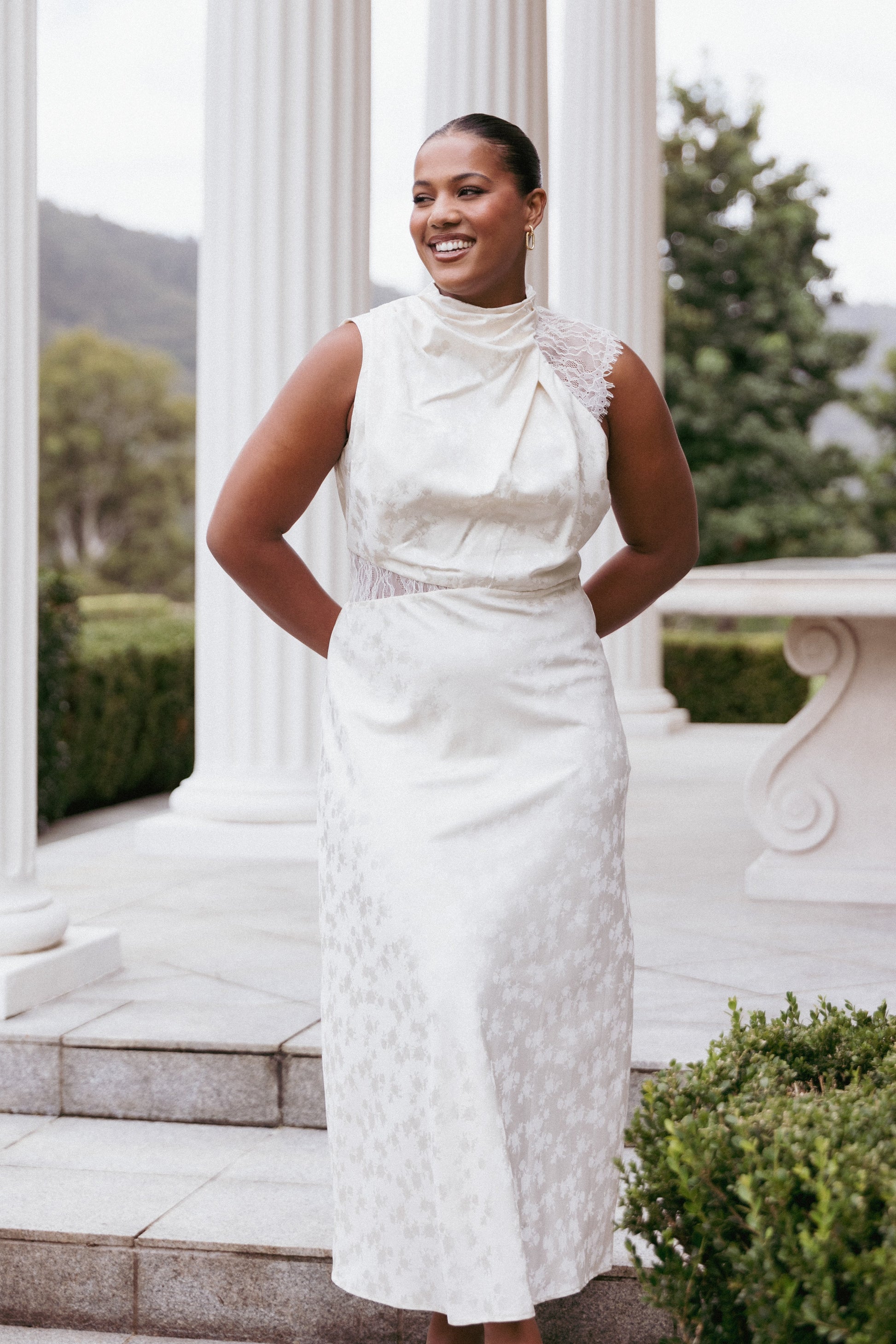 DETAILS Designed with a maxi length for a sleek silhouette, this dress features a sleeveless design and an asymmetric high round neckline that exudes modern elegance. Intricate lace detailing adds a touch of allure, while the oversized floral print ensures a bold, fashion-forward statement.