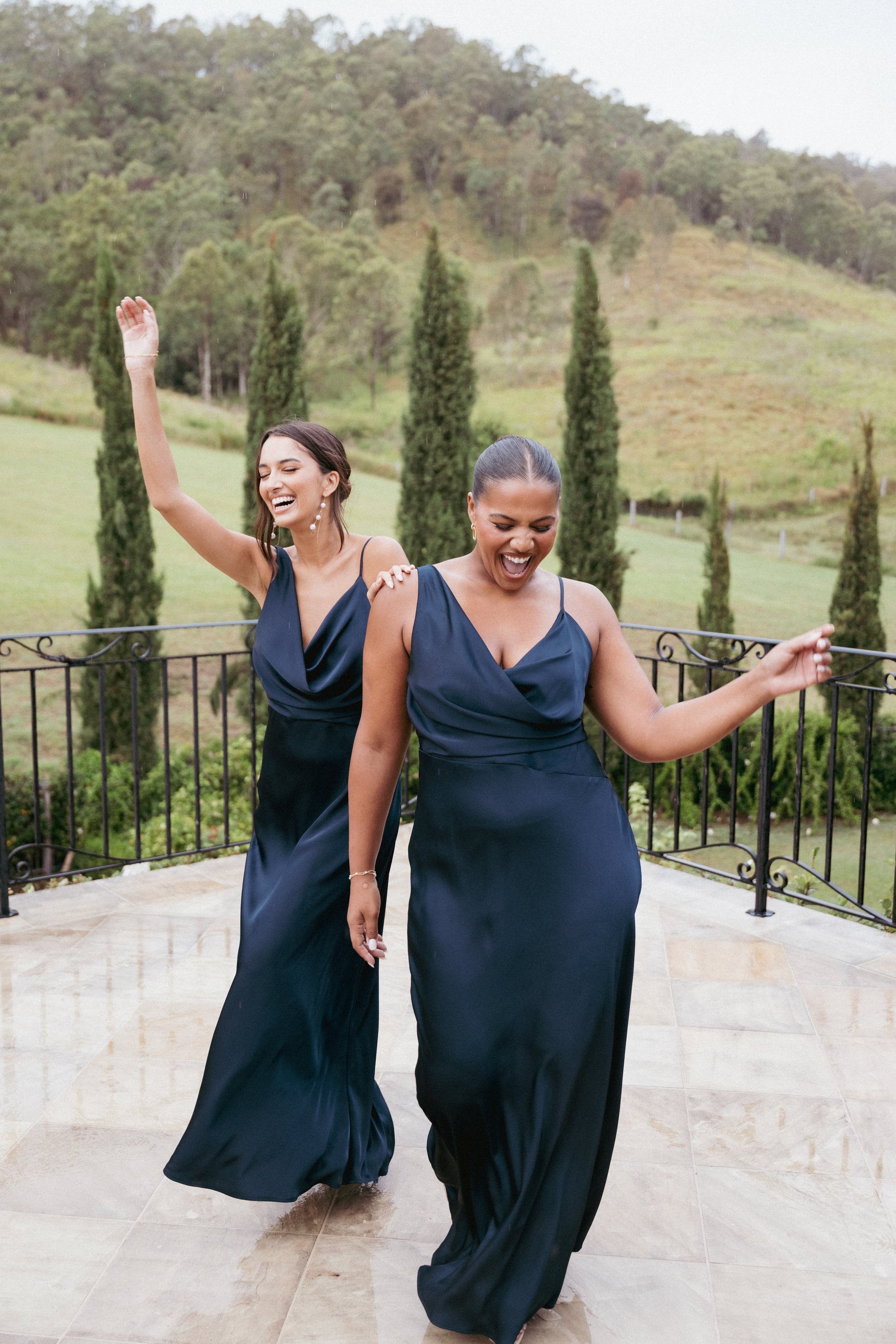 DETAILS Effortlessly chic, the Anela Asymmetric Midi Dress in Navy is your go-to for modern elegance with a twist. Designed with a flattering cowl neckline and asymmetric straps, it's equal parts stylish and versatile. The elasticized back and adjustable straps ensure a perfect fit, while the invisible side zip adds a seamless finish.?