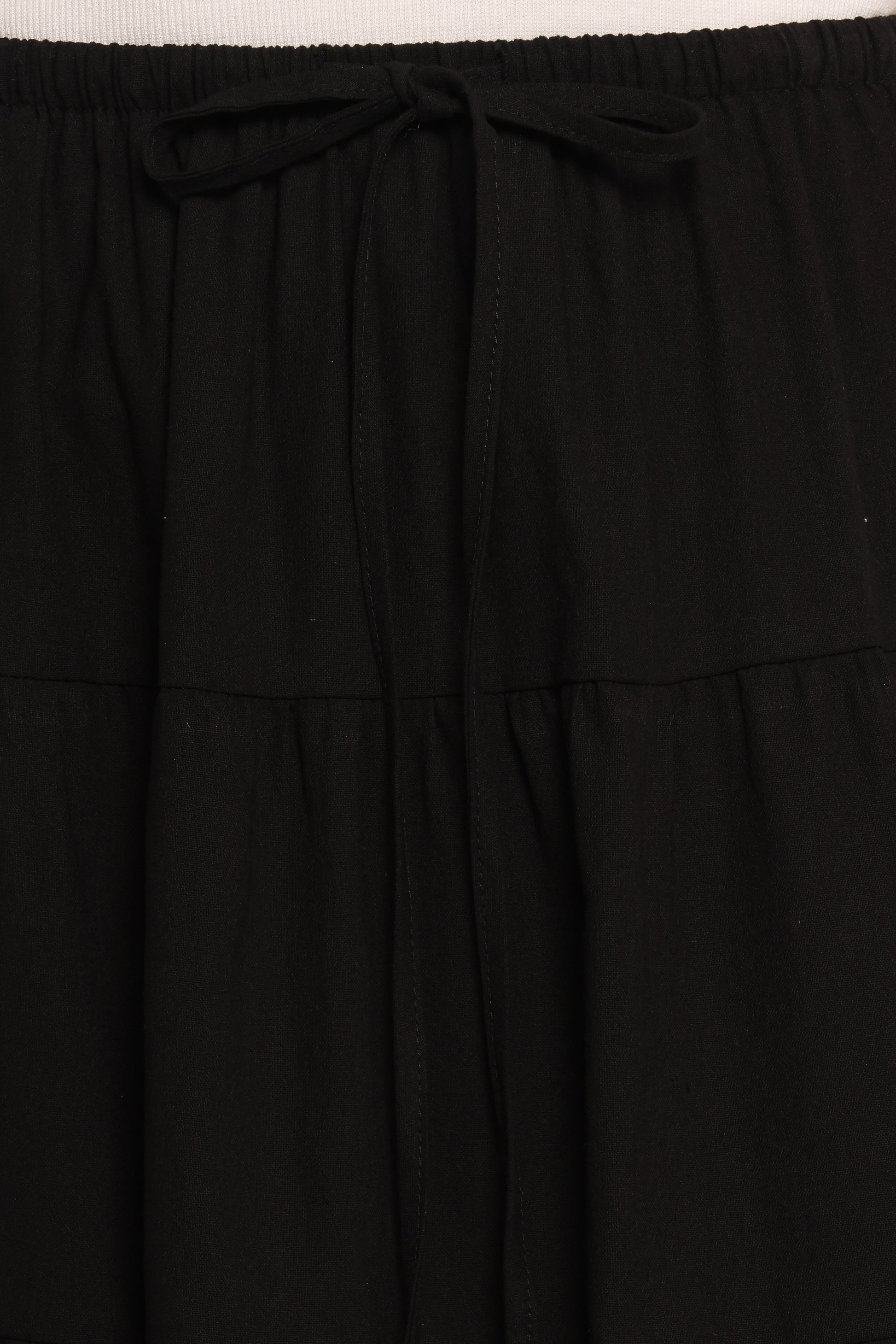 DETAILS This high-waisted skirt effortlessly flatters any figure, thanks to its elasticised waistband with a chic drawstring tie closure for that perfect fit. The A-line silhouette cascades into a beautiful tiered design, creating movement and fluidity with every step you take.