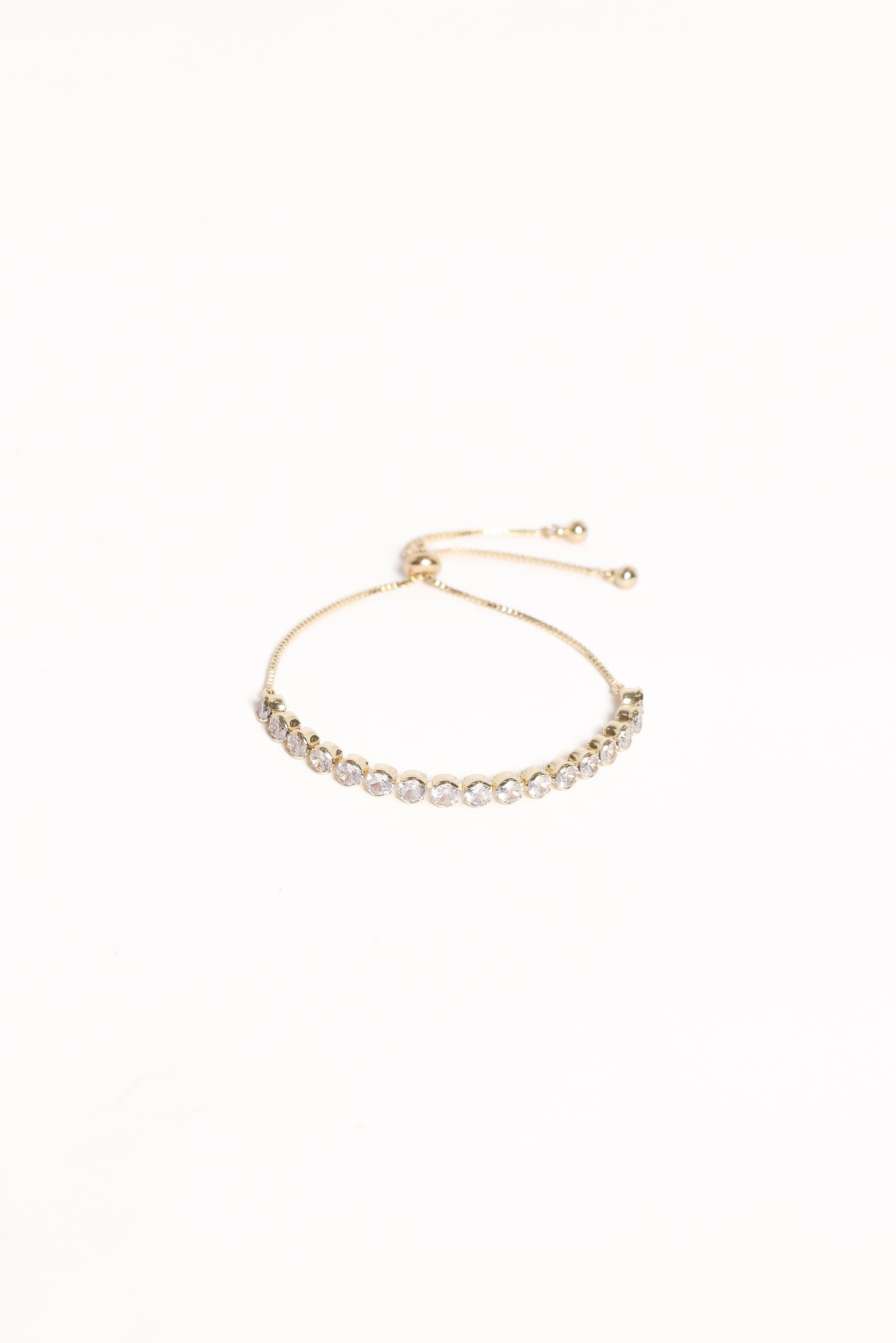 DETAILS Elevate your wrist game with the Ash Bracelet - Gold, where elegance meets modern design. Inspired by the timeless tennis bracelet, its crystal embellishments shimmer beautifully, catching the light with every movement.