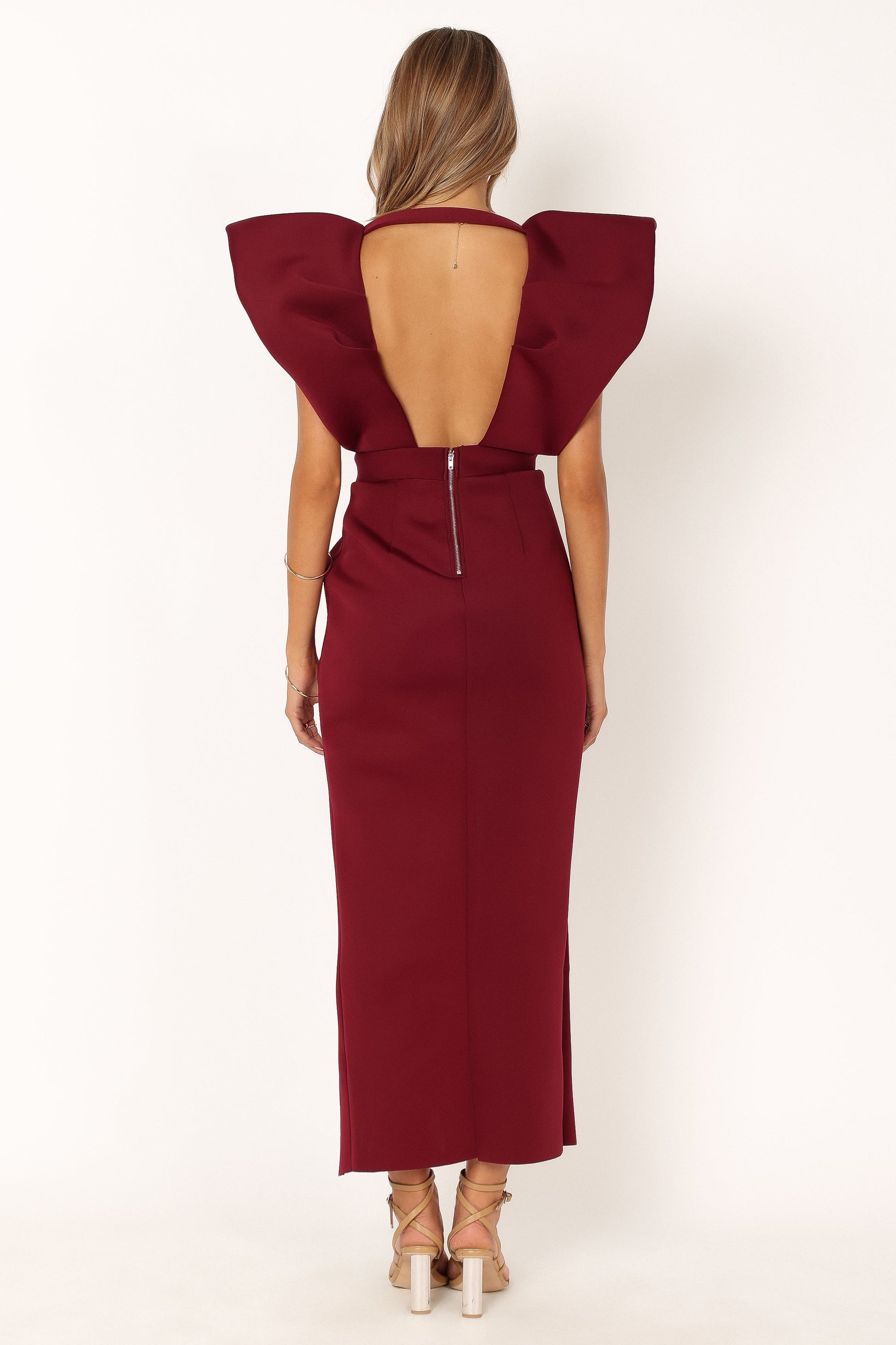 DETAILS Step into the spotlight with the alluring Augie Frill Shoulder Maxi Dress in stunning burgundy! This piece features a daring plunging V neckline and charming short puff sleeves, destined to make every entrance a dramatic one. The highlight is the flirtatious open back, teasingly complemented by a back zip with a hook and eye clasp.