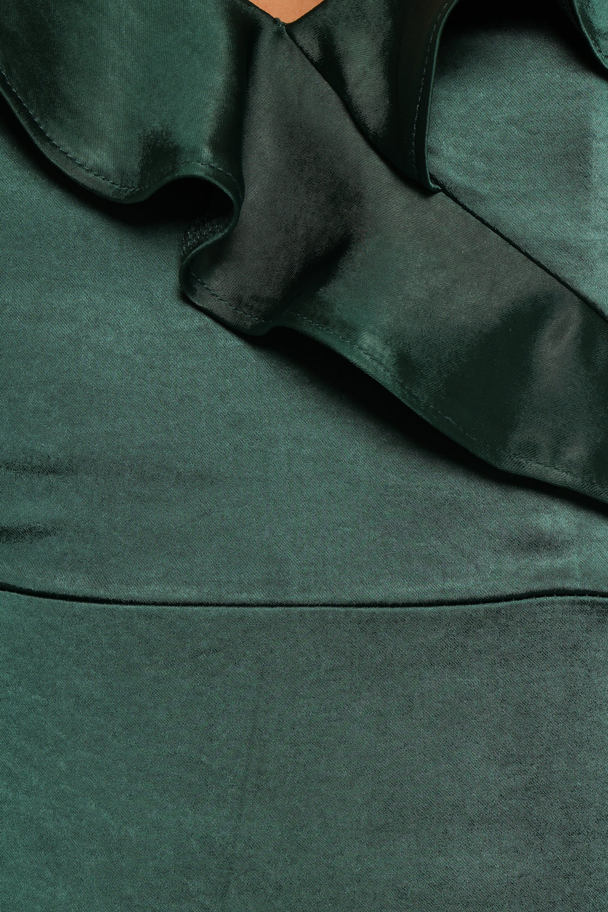DETAILS This stunning midi-length dress features a flattering v-neckline and thin adjustable straps that ensure the perfect fit for any occasion. The back invisible zip adds a sleek finish, while the ruffle detail and open front split feature bring a touch of grace and movement to your look.