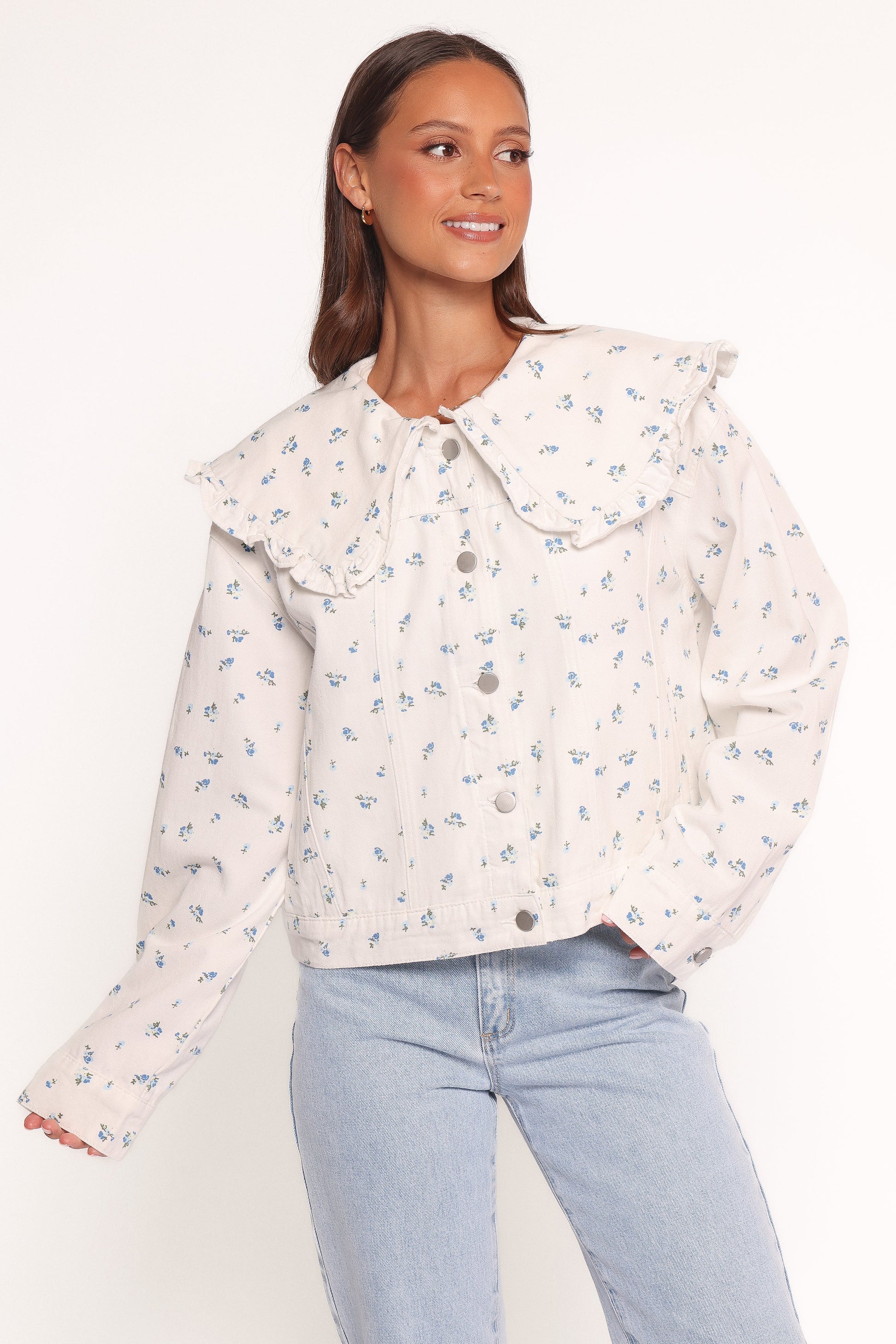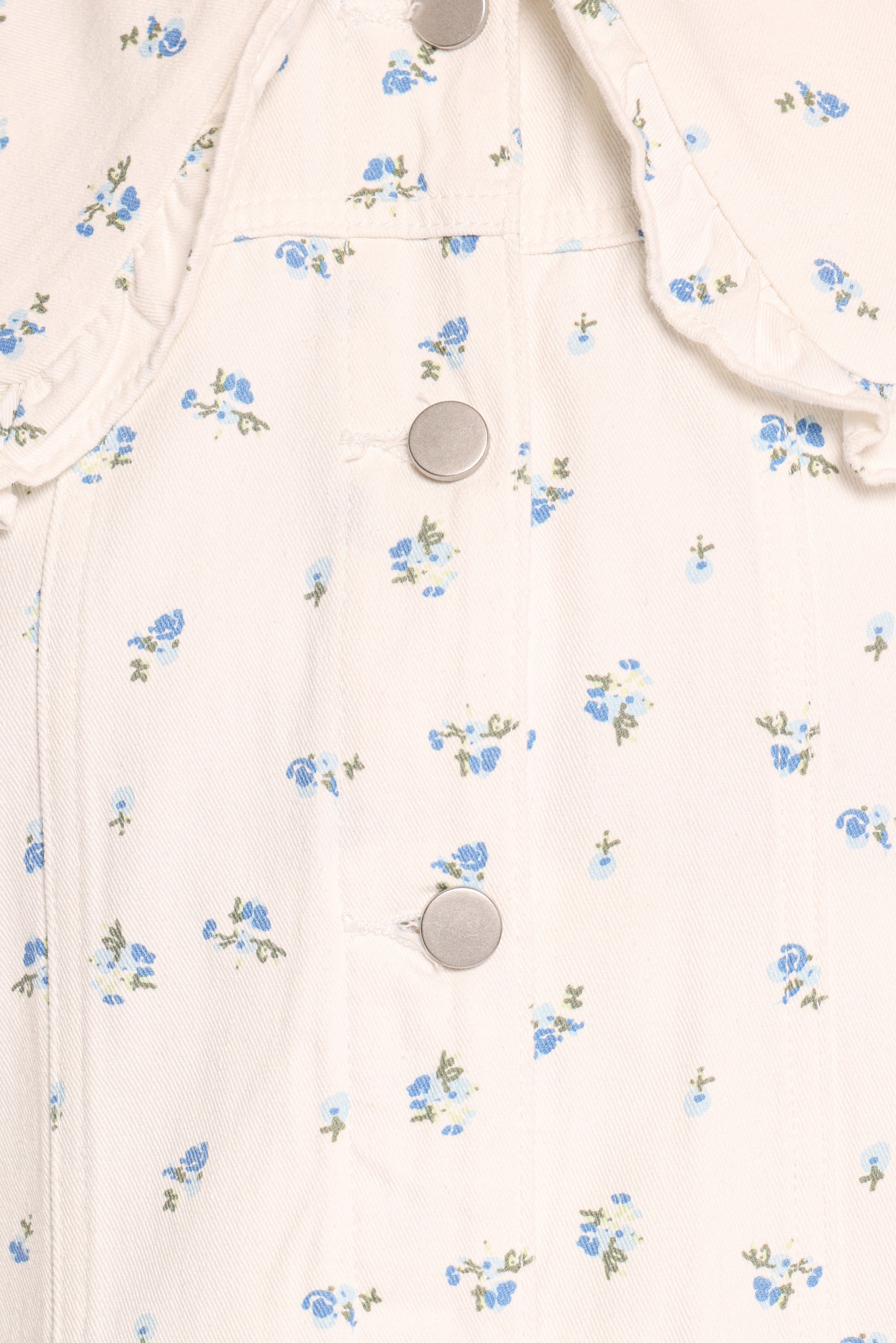 DETAILS Elevate your outerwear game with the Blue Flower Denim Jacket in Off White, a perfect fusion of timeless denim and delicate floral charm. Featuring a wide collar with a frill trim for a chic, tailored look, and long sleeves with button cuffs that add a polished touch, this jacket effortlessly blends practicality with style.