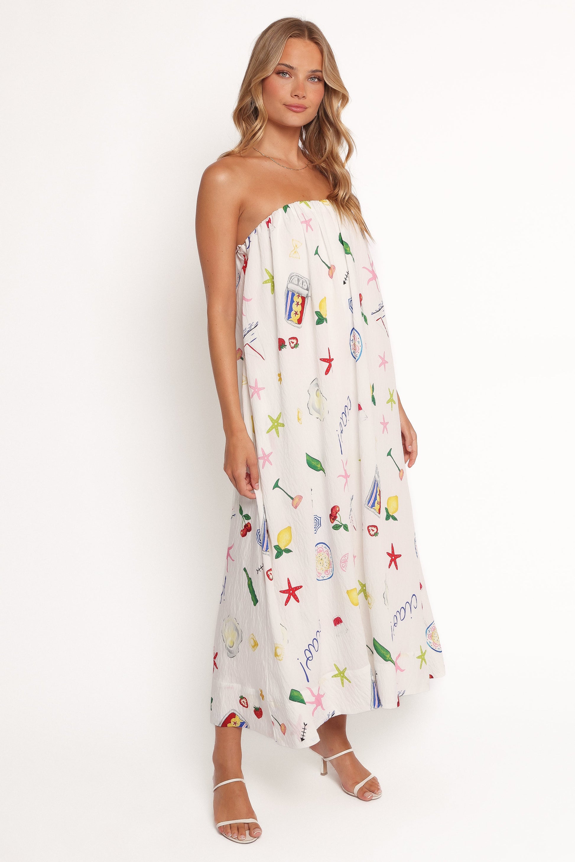 DETAILS Designed with a striking abstract print that blends bold and delicate tones, this strapless maxi dress is perfect for turning heads at any occasion. The A-line silhouette flows beautifully, offering both comfort and a flattering fit for all body types.