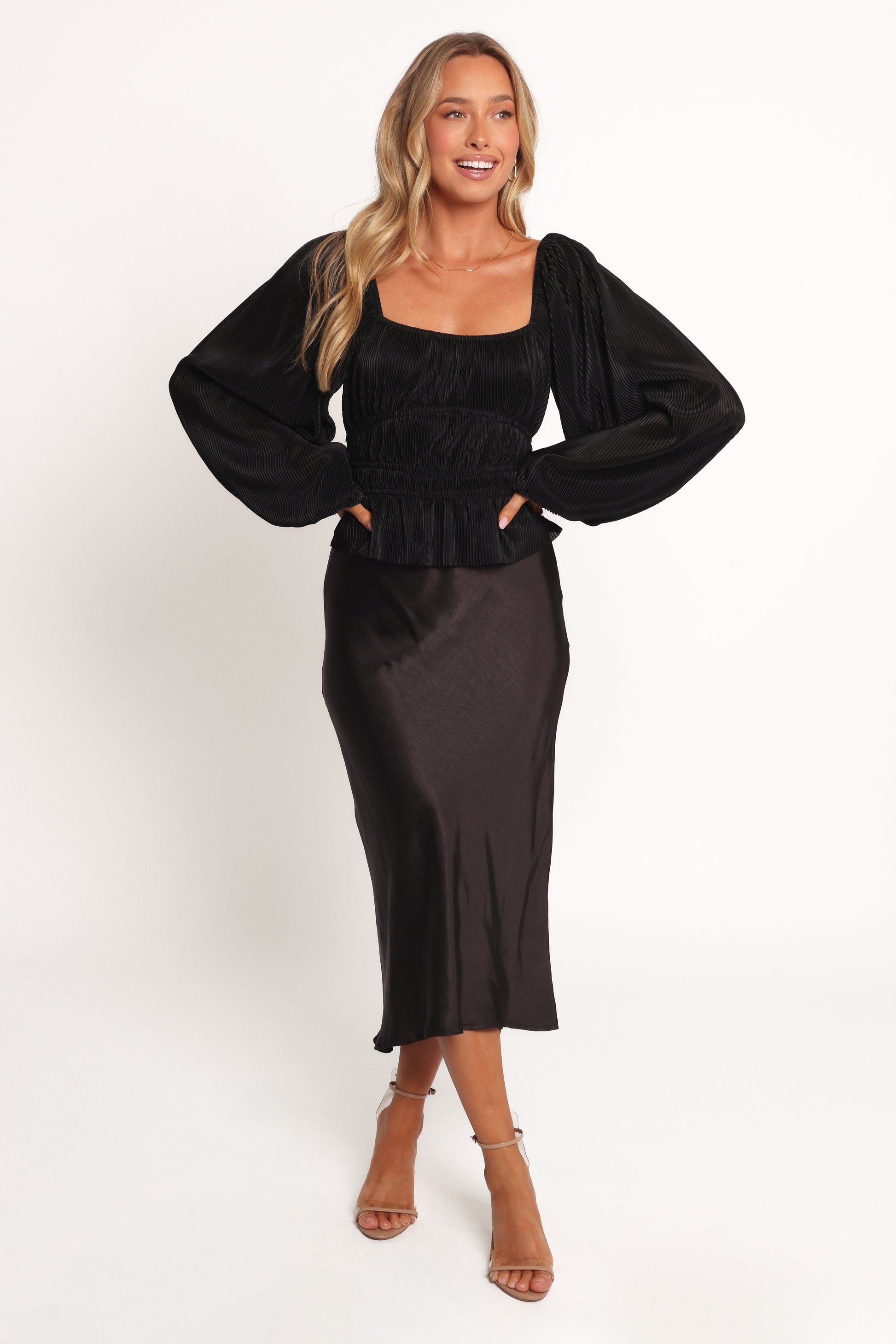 DETAILS Meet the Ceppia Plisse Top in Black, your new go-to for effortlessly chic style. This trendy crop-length top highlights a scoop neckline that perfectly frames your collarbone, while the long, balloon-style sleeves with elasticised shoulders and cuffs add a touch of drama and romance to your silhouette.?