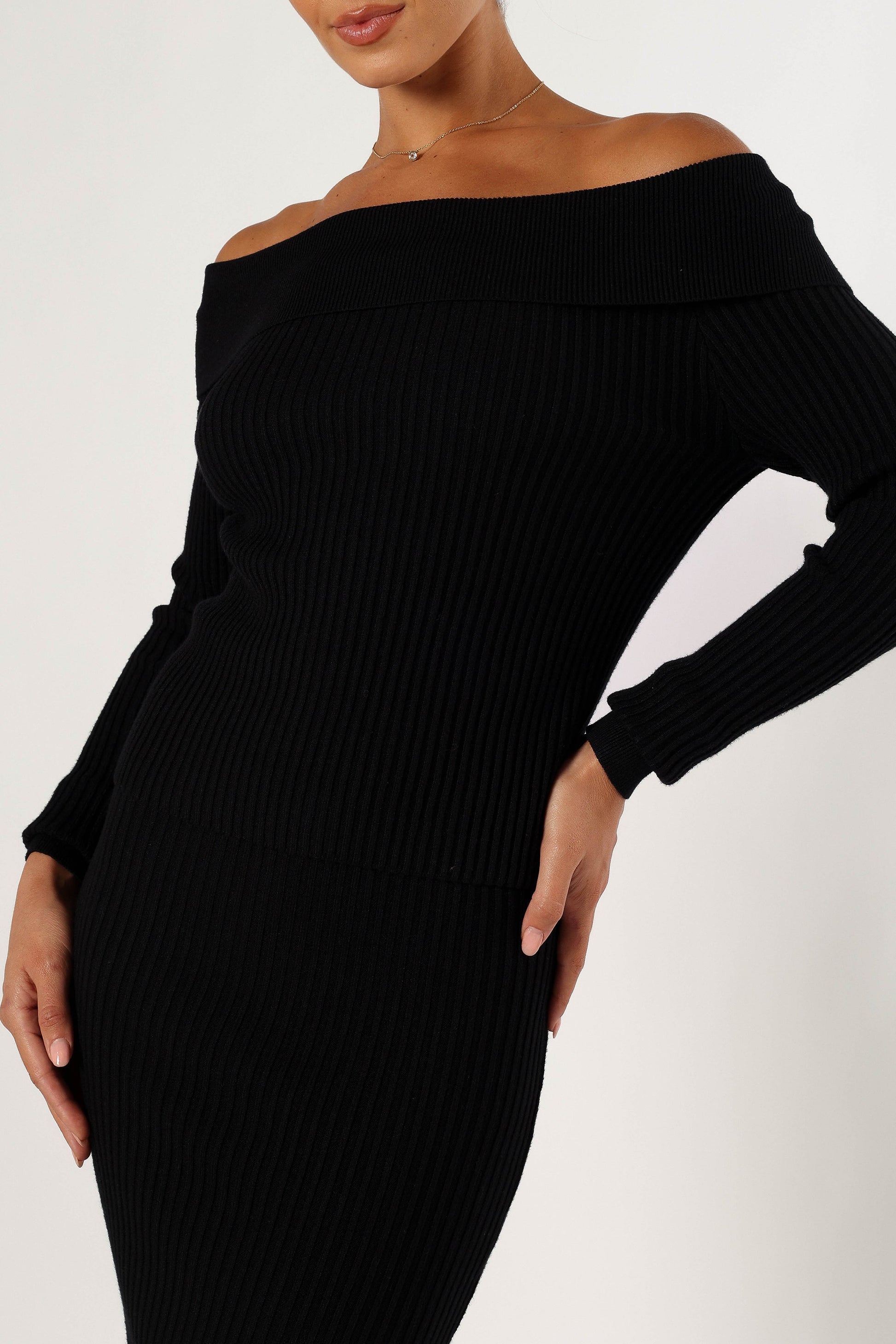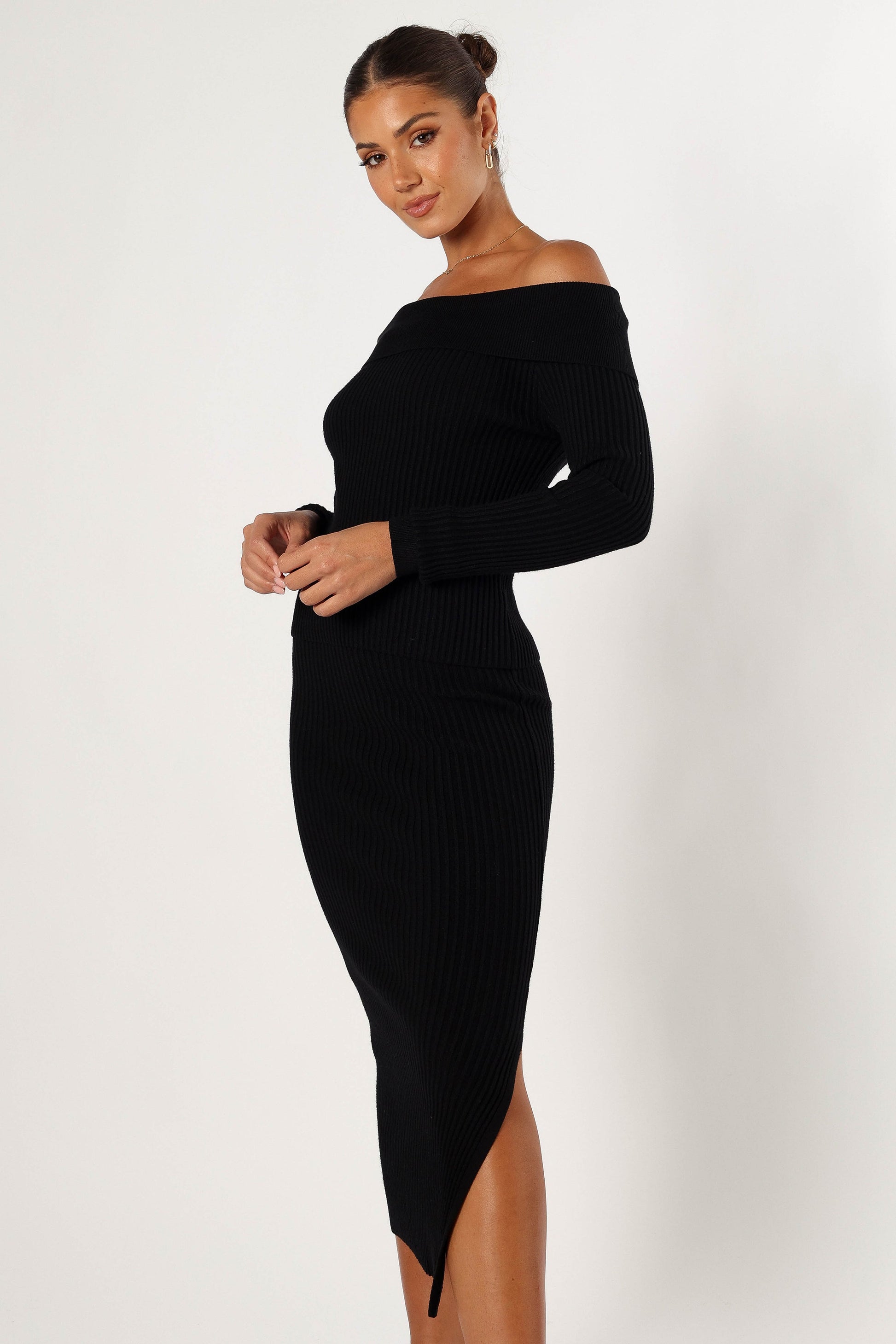 DETAILS The Charlotte Knitted Set in black is a must-have for any fashion-forward individual. This top and skirt set features an off the shoulder style neckline, providing a flattering and trendy look. The midi length knit skirt is perfect for any occasion, from casual to formal settings.