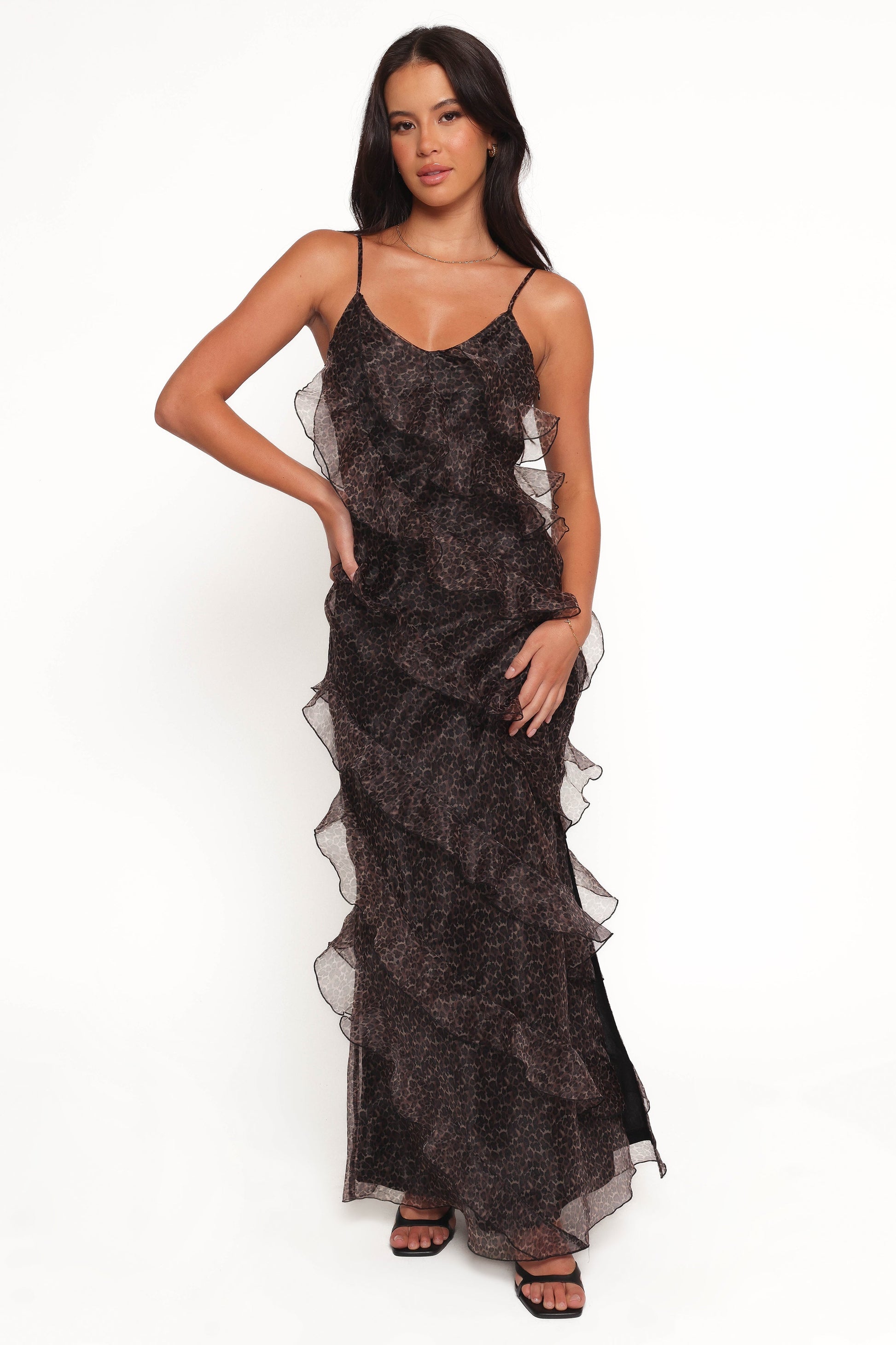DETAILS Step into the spotlight with the Ciao Ruffles Maxi Dress in Black Leopard. This eye-catching piece combines elegance and playfulness, making it the perfect addition to any wardrobe. The maxi length and v neckline create a silhouette that's both sophisticated and effortlessly chic, while the thin adjustable straps and invisible side zip ensure a tailored fit that flatters your figure.