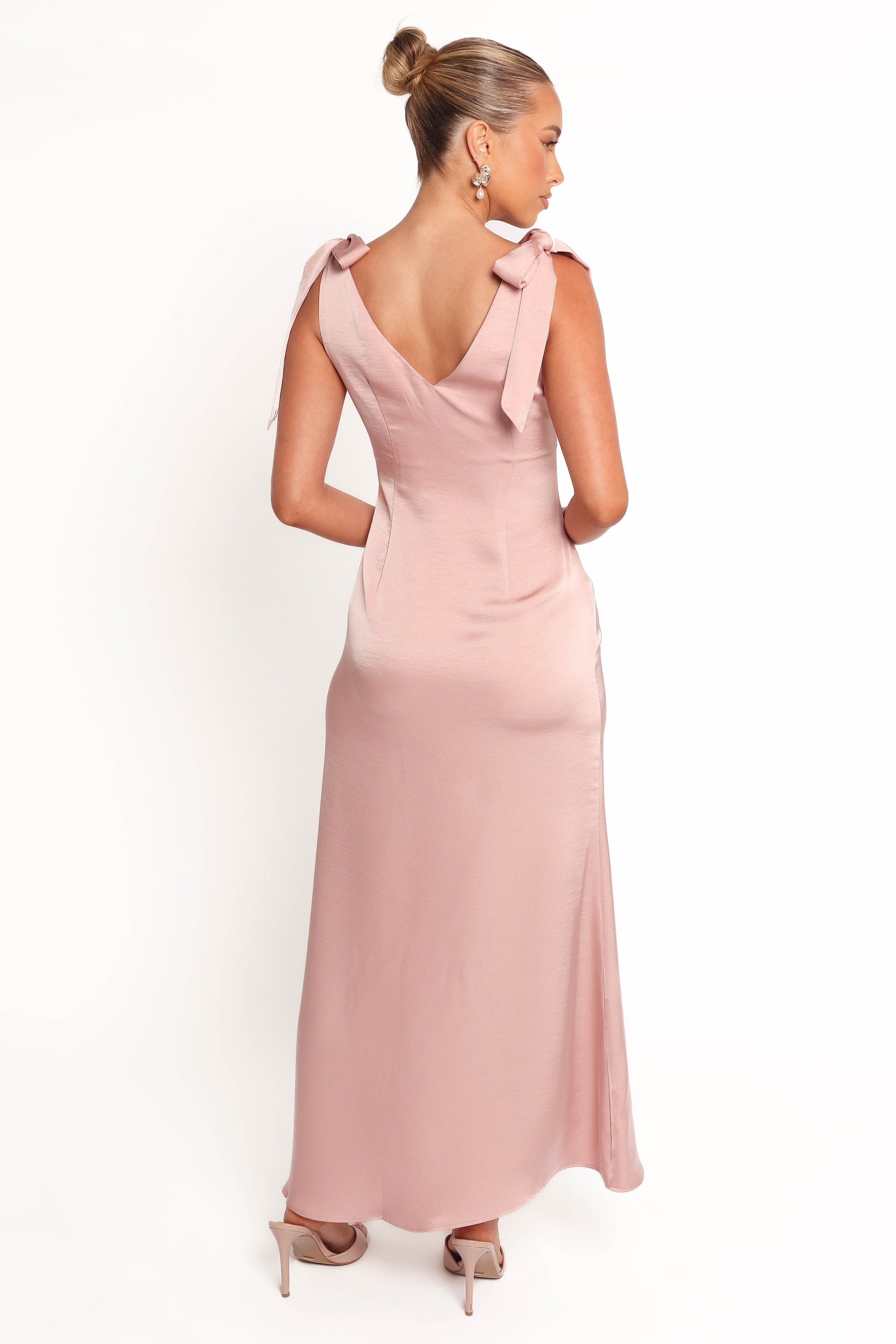 DETAILS Featuring a sleek midi length and a stylish V neckline, this dress is your answer to chic versatility. The tie-close straps add a customisable and modern touch, while the back V design brings unexpected detail that elevates the look from any angle.