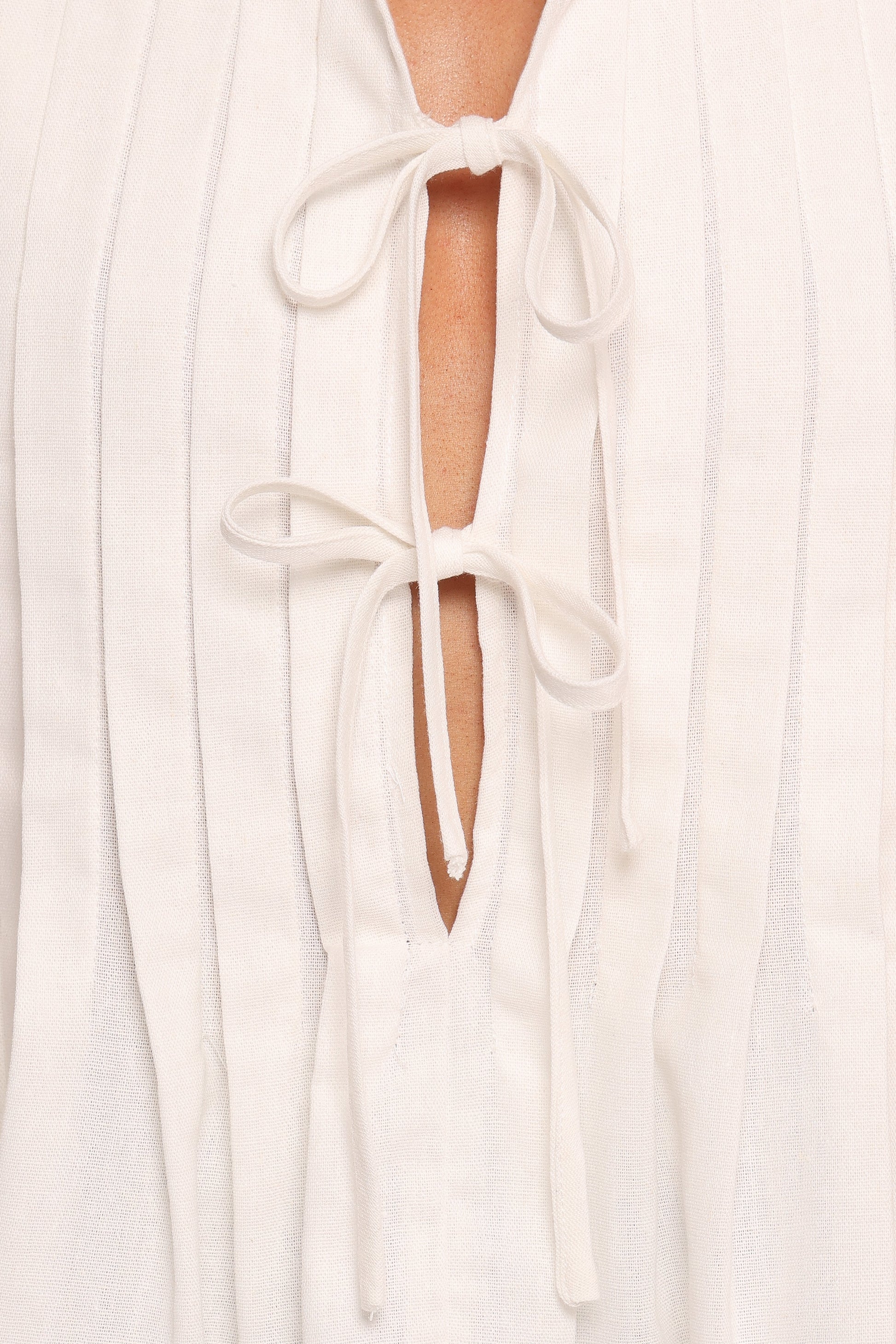 DETAILS Elevate your wardrobe with the Delia Pleat Tie Top in a stunning shade of blue. This chic piece features a round neckline and a deep V-front with a charming tie closure, presenting an effortlessly stylish look that's perfect for any occasion.