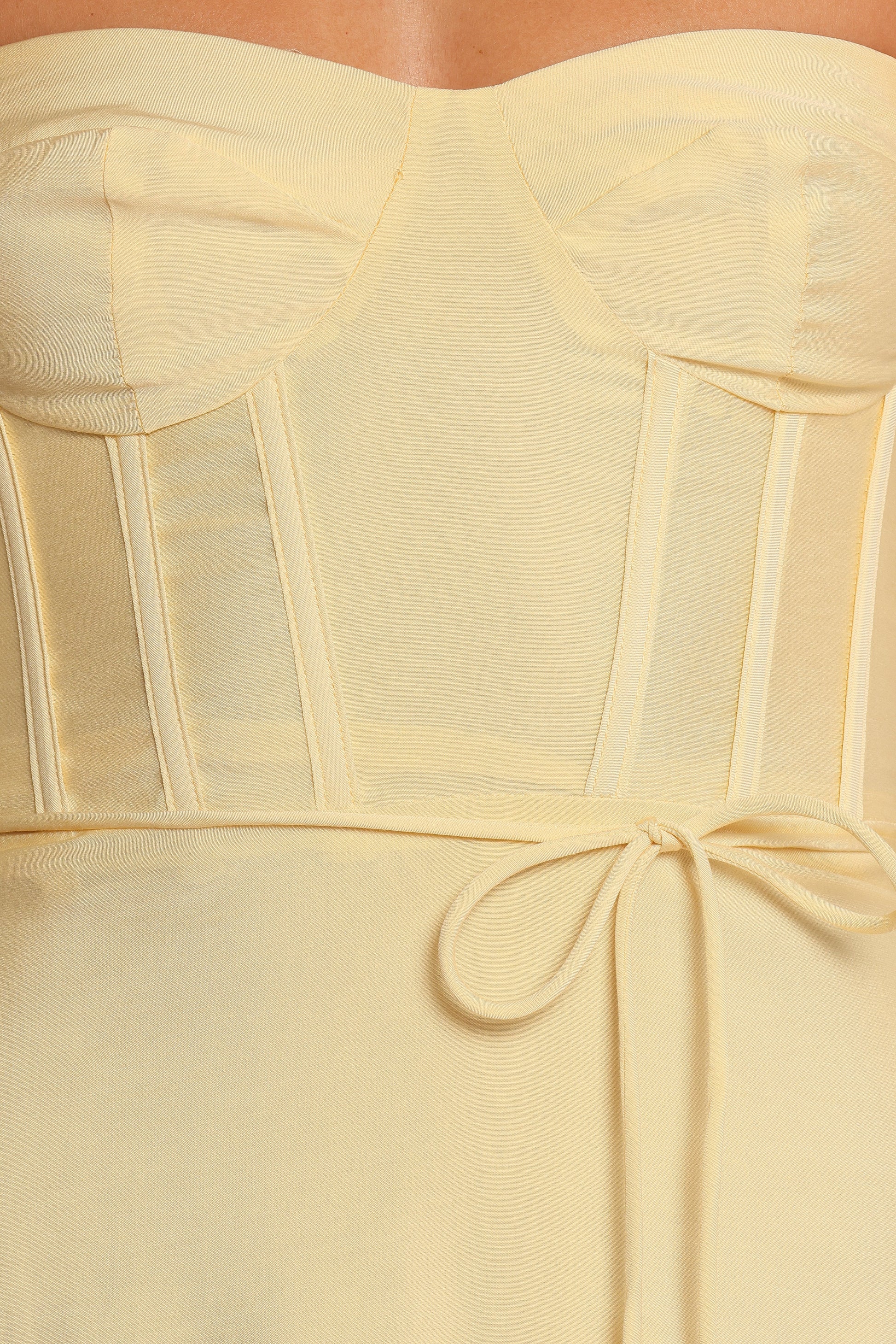 DETAILS Step into effortless elegance with the Della Midi Dress in Yellow. Perfectly designed to strike the balance between chic and comfortable, this dress features a flattering sweetheart neckline and thin tie-close straps for a customisable fit.