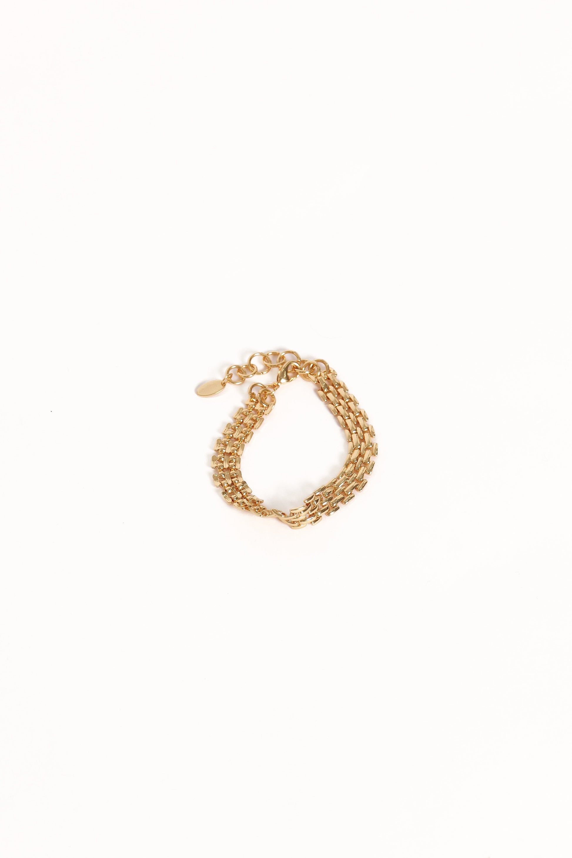 DETAILS Elevate your style with the Drew Bracelet in Gold, a perfect blend of timeless elegance and modern flair. Crafted with a woven mesh chain, this bracelet offers a delicate yet durable design that complements any outfit.?