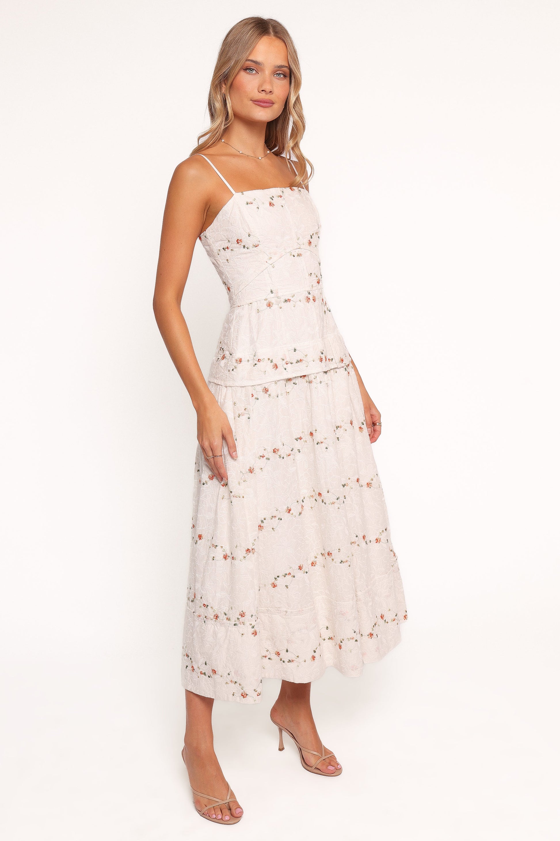 DETAILS Achieve effortless elegance with the Eleanora Midi Dress in White Floral. This stunning piece combines timeless charm with modern details, featuring a midi-length silhouette and a classic square neckline that's perfect for your next garden party, brunch, or weekend getaway.