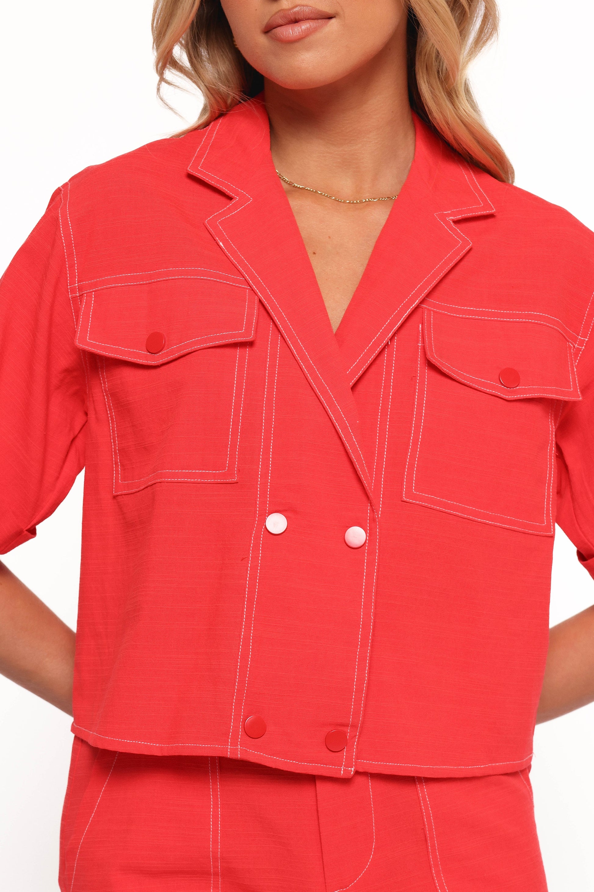 DETAILS This chic, cropped-length shirt is designed for the modern fashionista who loves to turn heads effortlessly. The spread collar and v neckline create a flattering silhouette that accentuates your neckline, while the short sleeves with rolled cuffs add a touch of casual elegance.