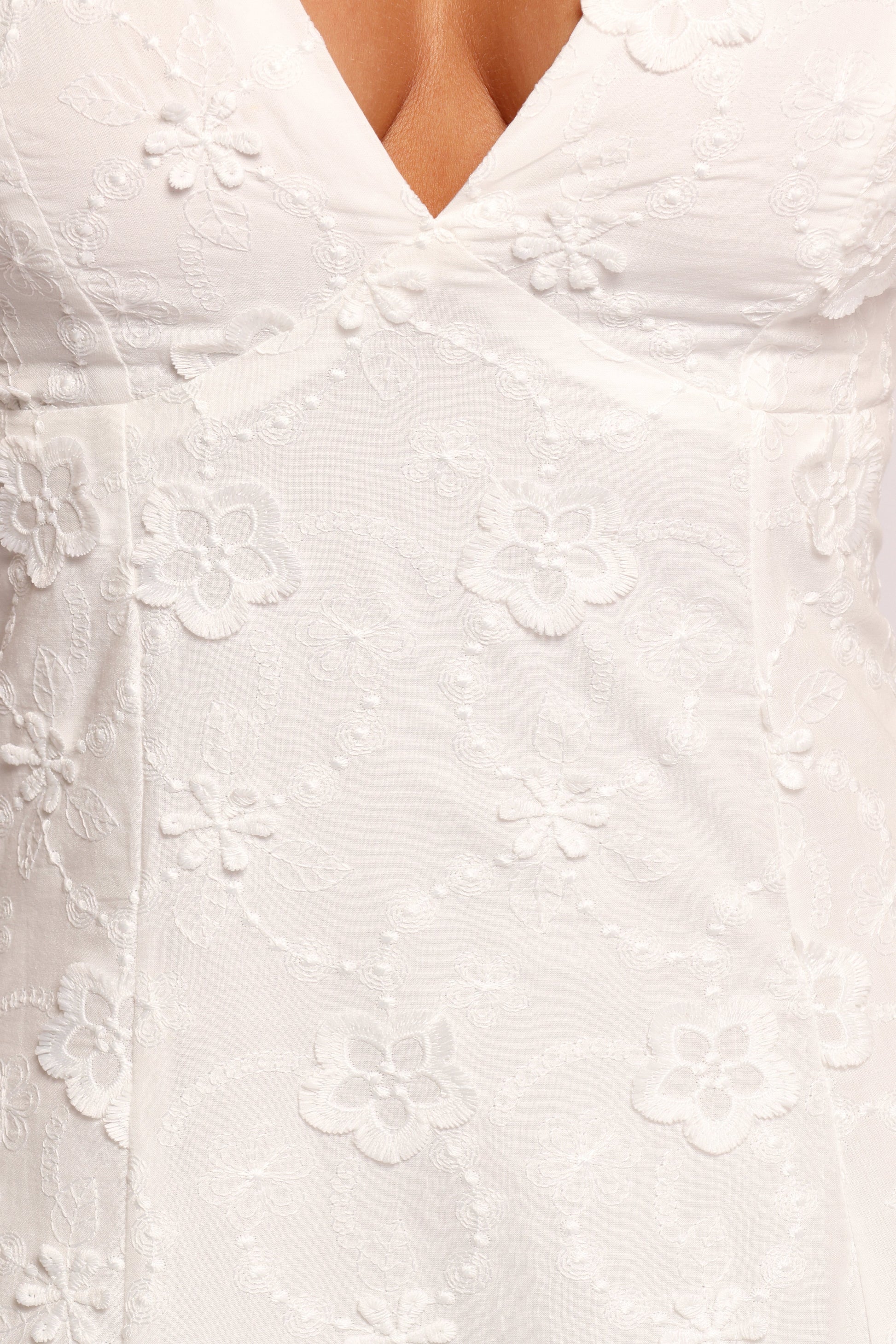 DETAILS Make an unforgettable statement with the Ford Maxi Dress in crisp white, a timeless combination of elegance and modern detailing. This floor-length silhouette features a deep V neckline and thin adjustable straps, offering both comfort and sophistication for any occasion.