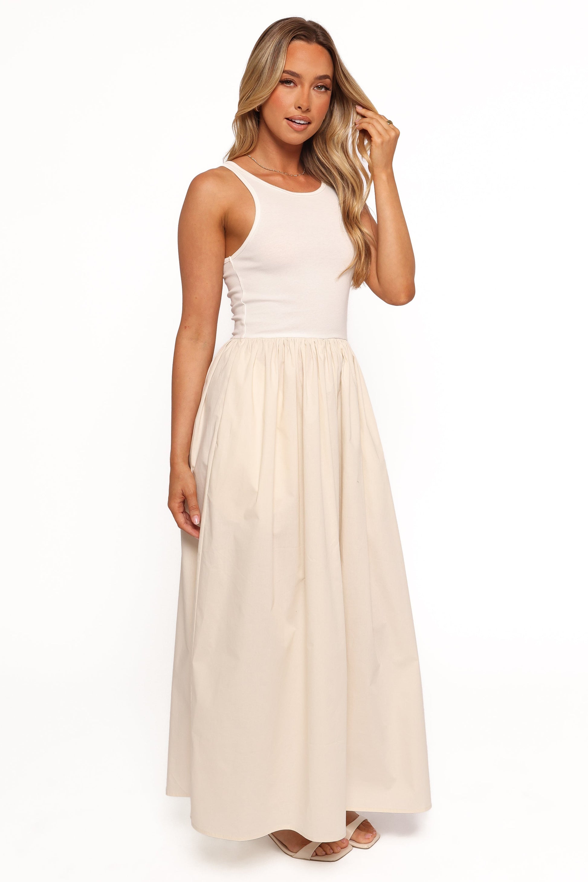 DETAILS Experience effortless elegance with the Franki Midi Dress in White Cream. This chic piece combines a sleeveless tank-style top with a round neckline, creating a timeless silhouette that flatters any figure. The gathered A-line skirt flows gracefully, offering both comfort and style, while the elasticised waist ensures a perfect fit every time.