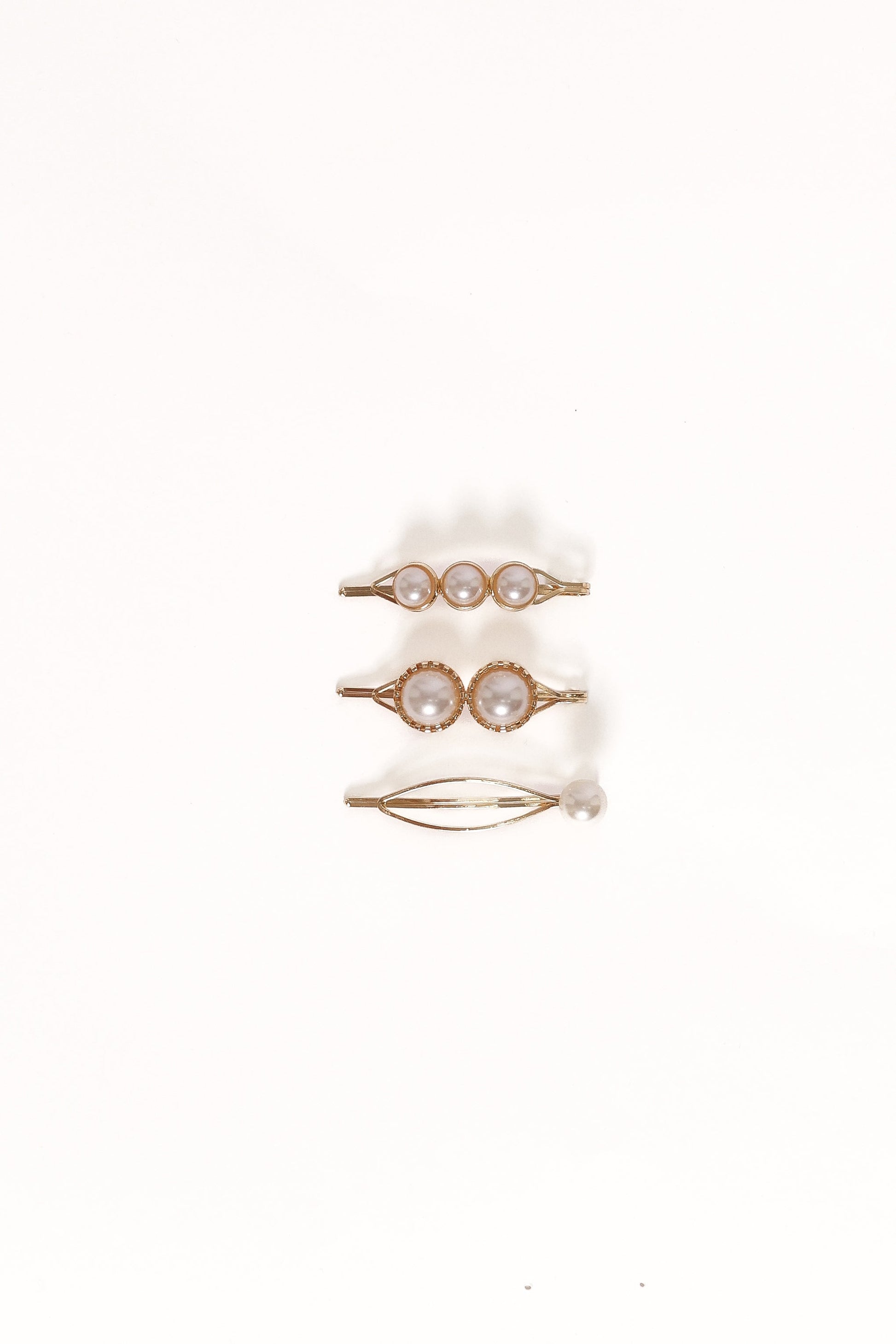 DETAILS This set of three includes stunning gold faux pearl barrettes that add a touch of understated luxury to any look, whether you're dressing up for a special occasion or adding a chic finish to your everyday outfit.