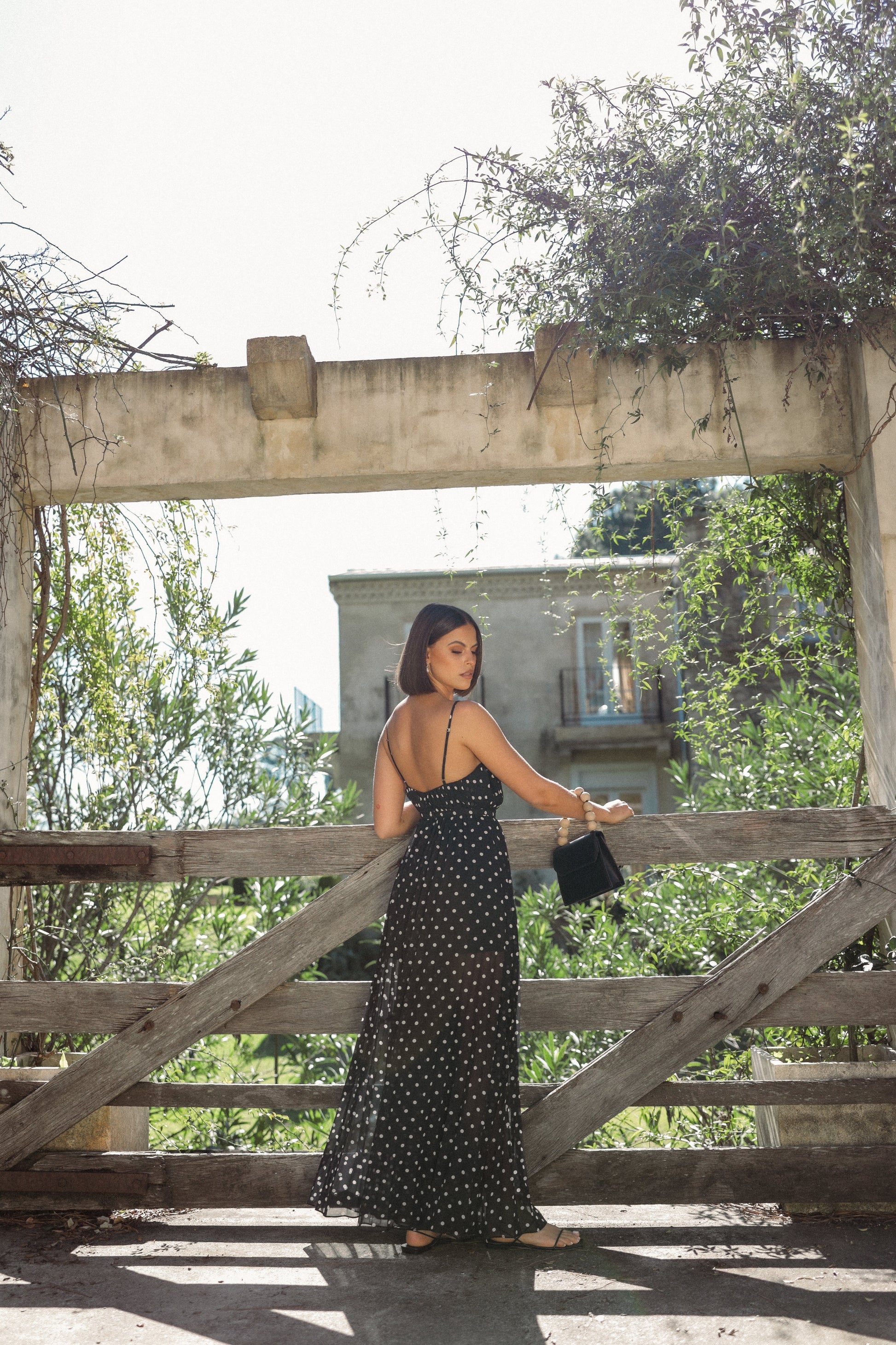 DETAILS Looking for a playful yet sophisticated?outfit?for your next event? The Hilary Jumpsuit features a v neckline and wide leg pant, which offer a flattering silhouette, but what truly makes this piece unique is its pleated detail and polka dot print.