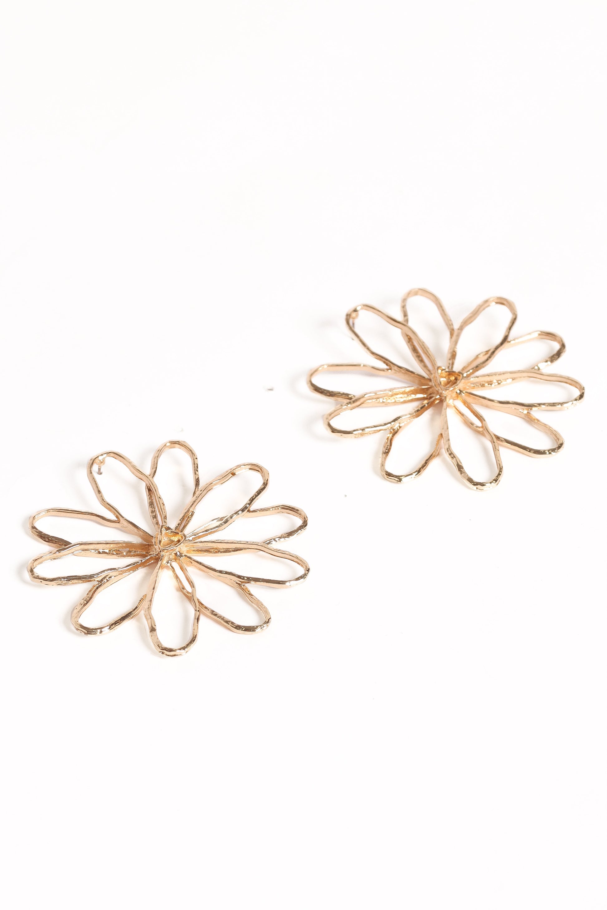 DETAILS Bring bold blooms to your everyday style with the Indi Flower Earrings in Gold. Featuring a striking large flower design and polished gold hardware, these earrings are the perfect statement piece to elevate any outfit.