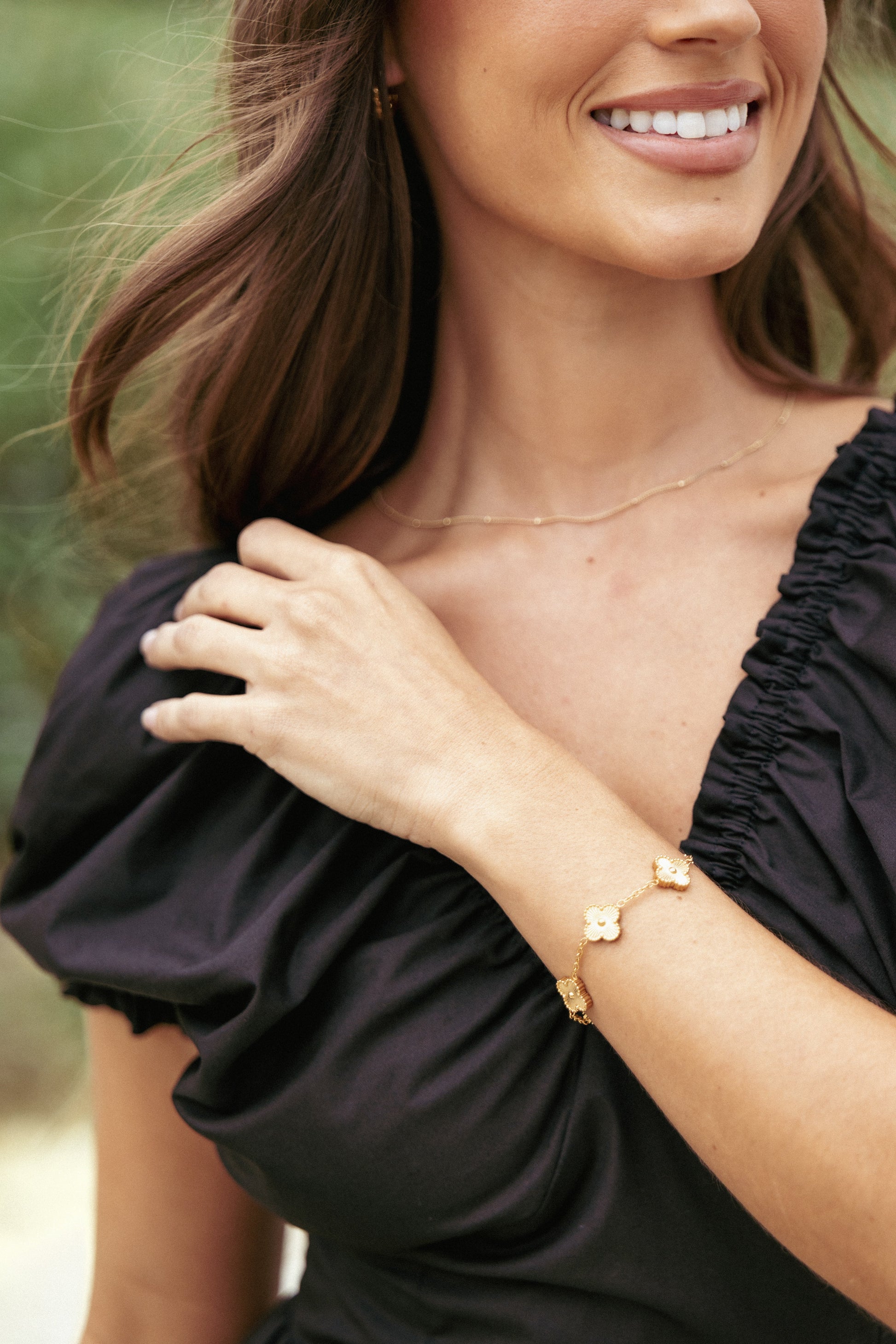 DETAILS Add a touch of elegance to your ensemble with the Ione Bracelet in Gold. Featuring a delicate flower charm and a timeless link chain design, this piece strikes the perfect balance between understated and eye-catching.