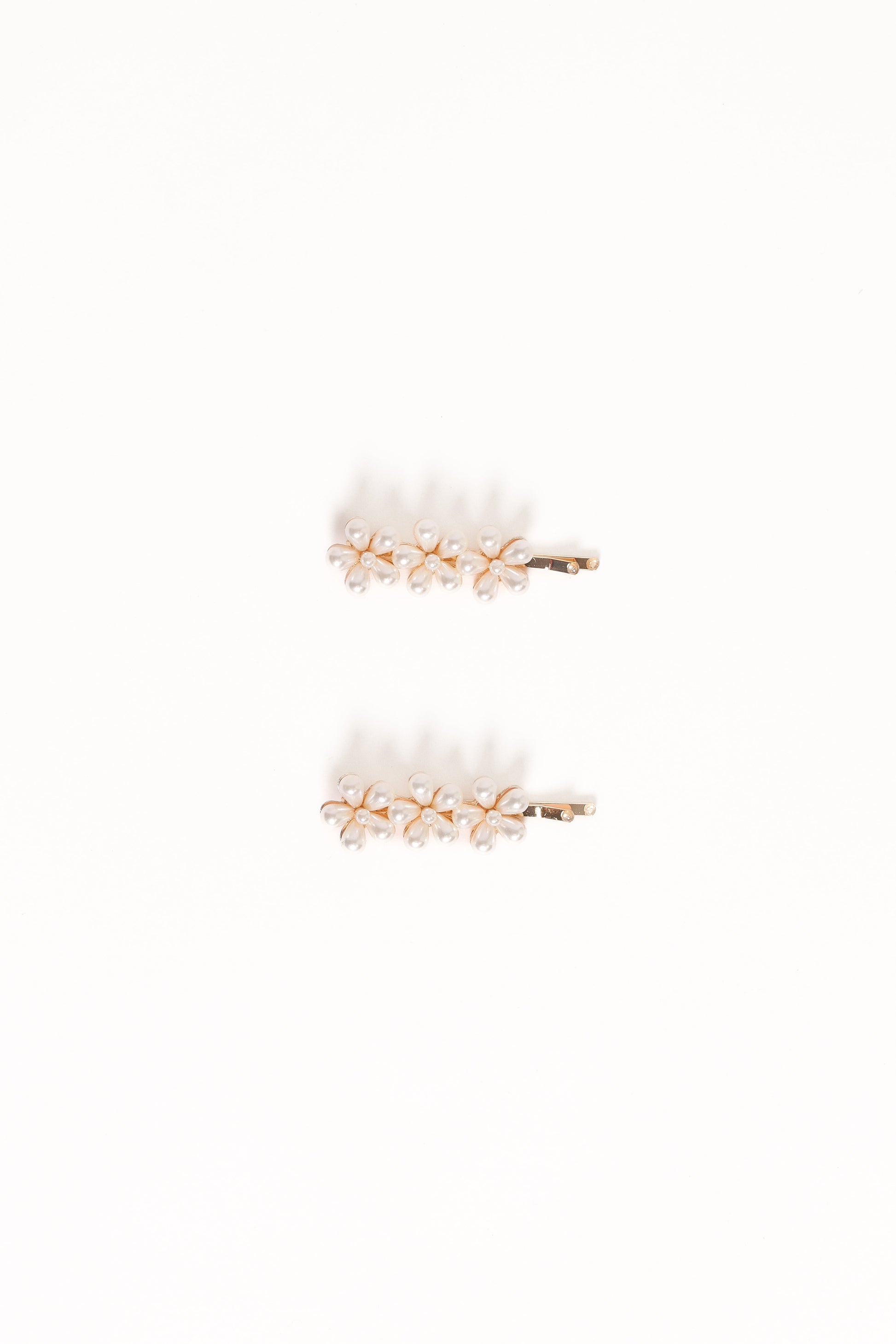 DETAILS Transform your hairstyle in seconds with the Isabella Hair Clip Set - Pearl. This set of two features an elegant flower design accented with delicate faux pearl detailing, adding a touch of timeless charm to any look.