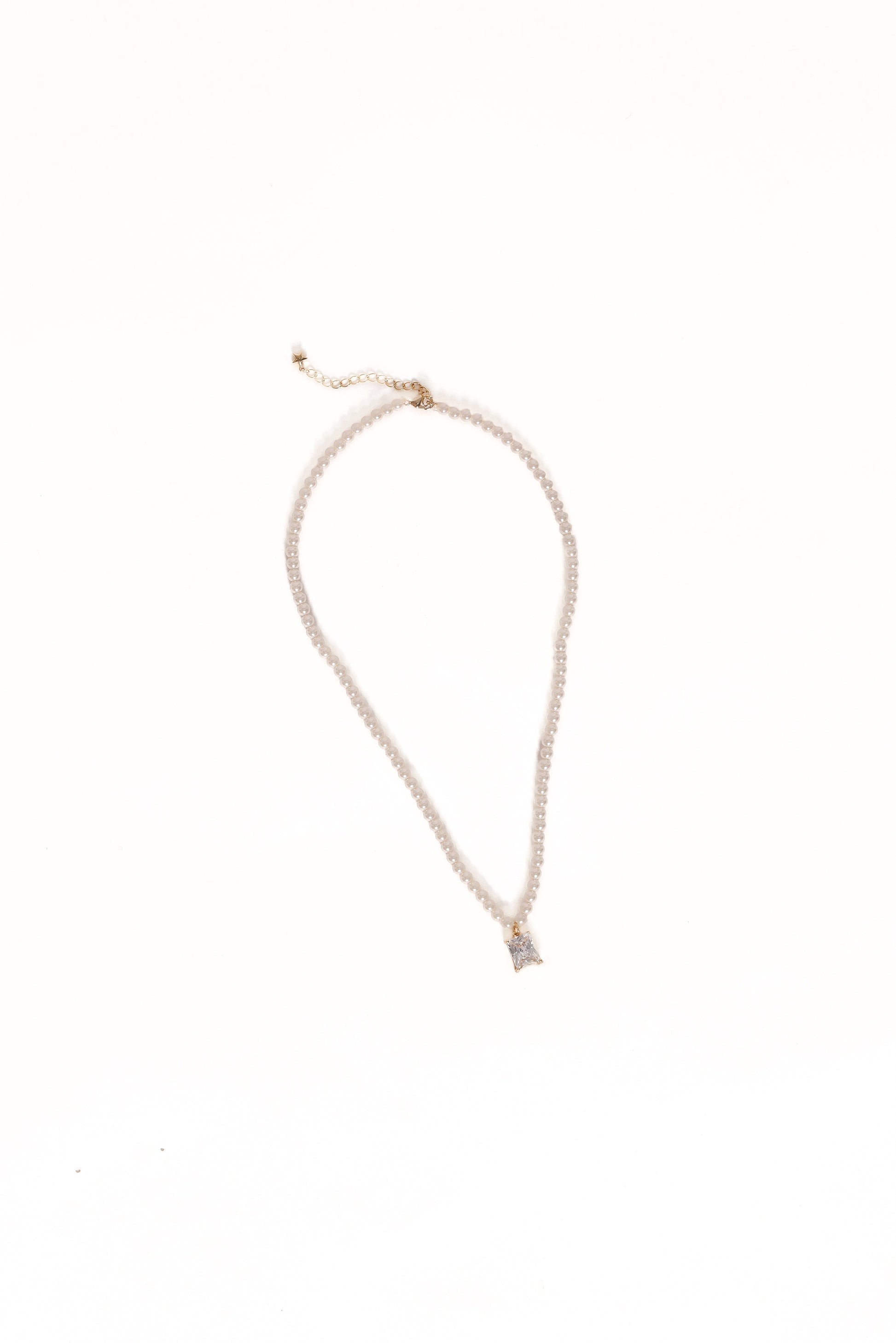 DETAILS This faux pearl necklace showcases an eye-catching emerald cut pendant, perfectly framed by sleek gold hardware that adds a touch of luxury to any outfit. The thoughtful clasp closure ensures a secure fit, while the extension chain allows you to customise the length to suit your neckline or layer with other favourites.