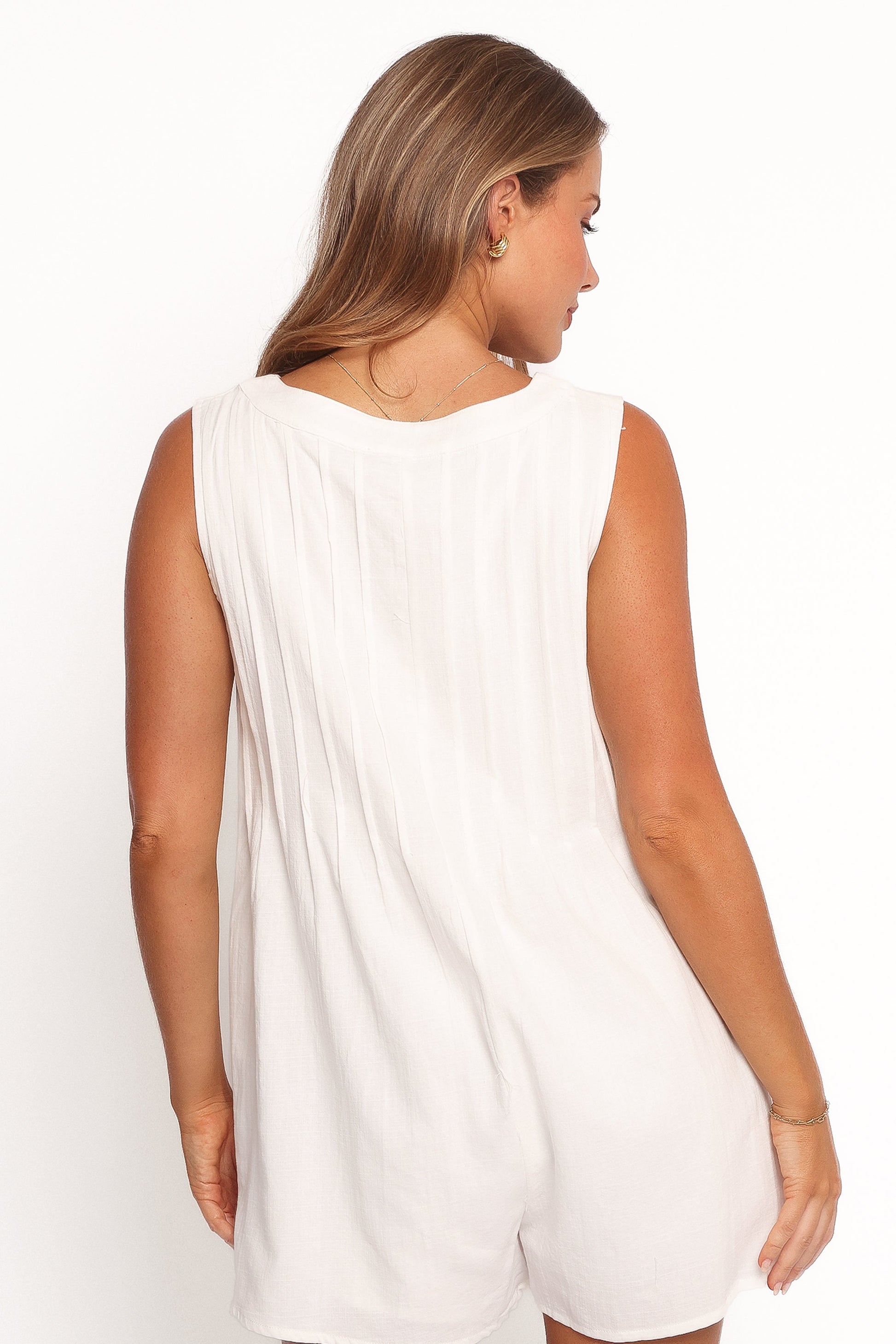 DETAILS Designed for both comfort and chic elegance, this romper features a flattering V neckline and a unique front tie detail that adds a touch of sophistication to your look. The pleated details offer a subtle nod to classic tailoring, ensuring this piece remains timeless.