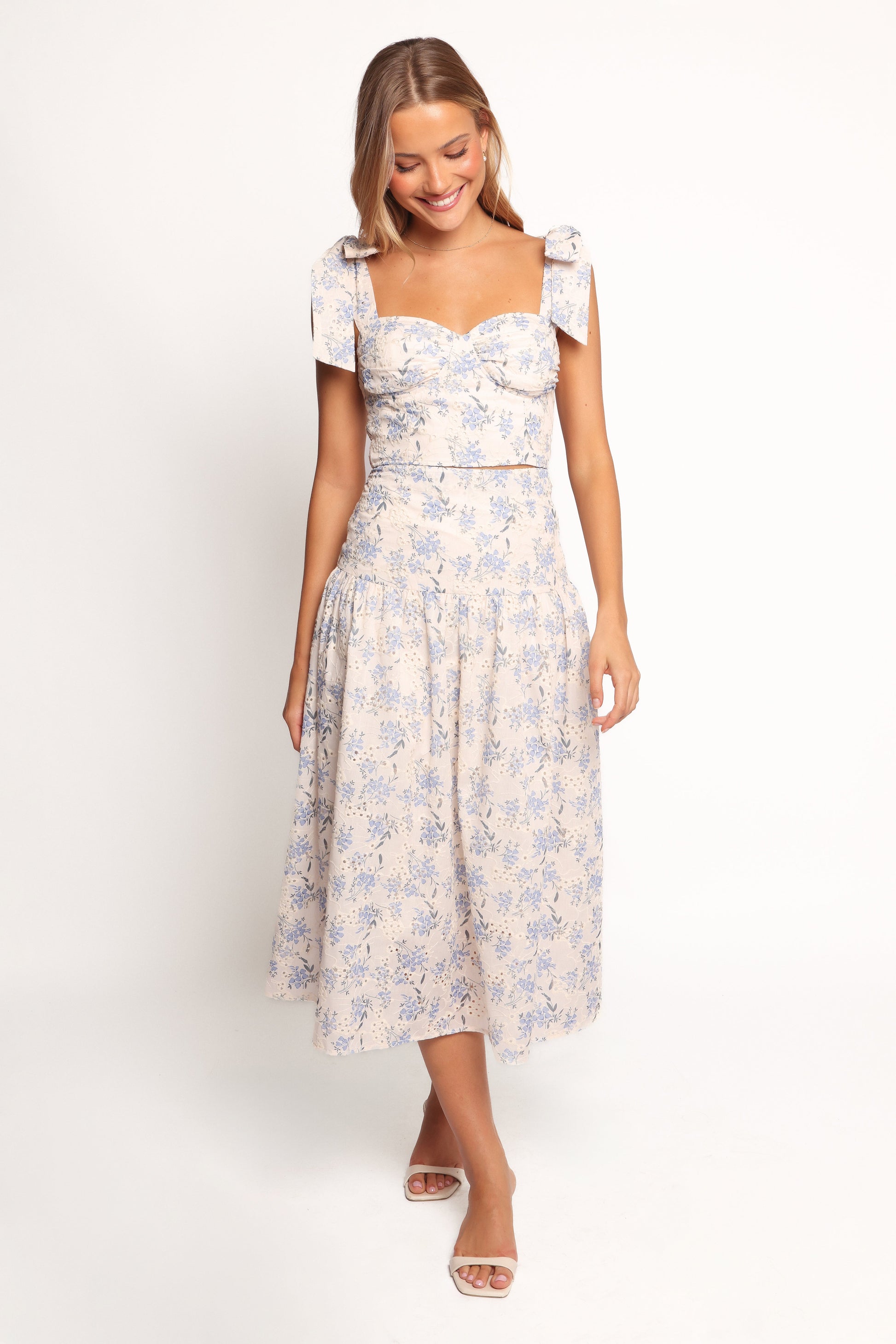DETAILS Designed for the trendy at heart, the set features a cropped-length top with a fun sweetheart neckline and padded bra cups for that extra comfort. The high-waisted skirt, graced with an invisible side zip and hook clasp, sweeps beautifully to a midi length.