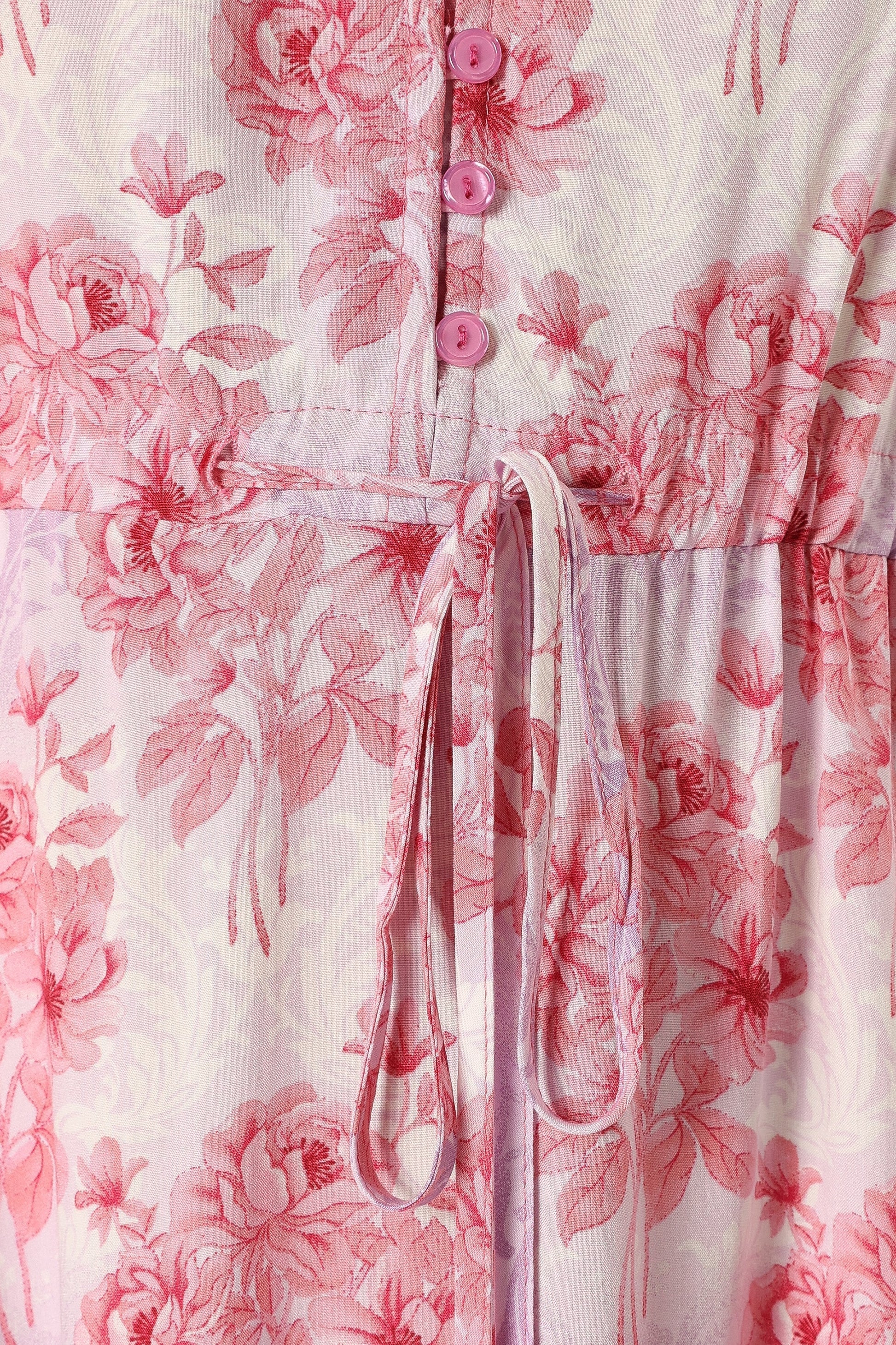 DETAILS Unleash your inner style maven with our vibrant, floral print maxi dress. This showstopper features a fun V-neckline and mid-length sleeves with charming elasticized cuffs. A row of functional buttons dances down the bodice, leading to a waist cinched with a fashionable tie detail.