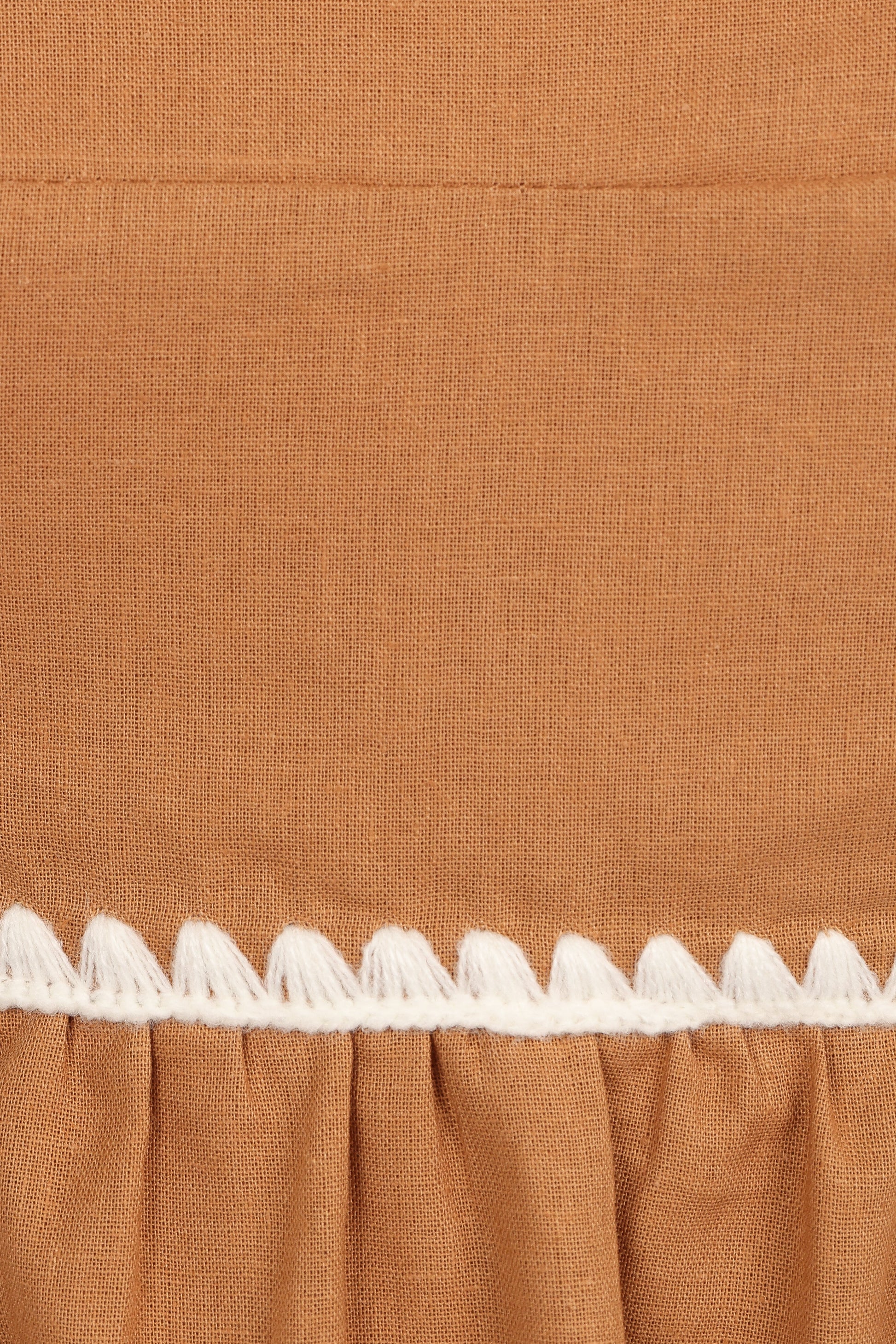 DETAILS Meet our darling Lino Contrast Trim Midi Dress in Tan White! This baby doll style frock features thin tie-close straps that fall over the shoulders to meet a chic square neckline. With a concealed back zip and a handy hook and eye clasp, you're assured a perfect fit.