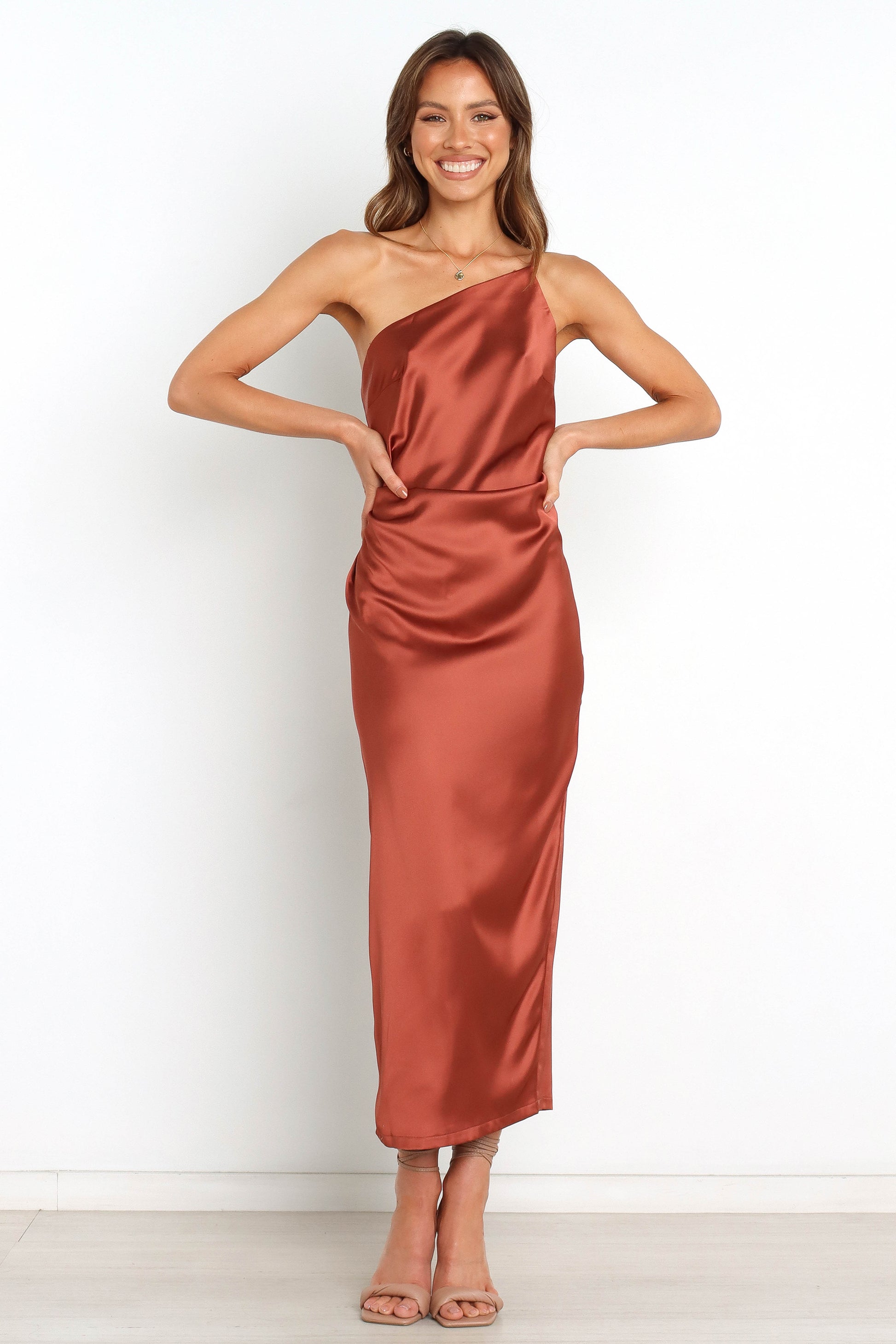 DETAILS Be the life of the party wearing this one-shoulder maxi dress. The gathered side detail adds a playful look, while the back invisible zip ensures a comfortable fit. You'll be sure to turn heads with its satin feel fabric that provides an elegant touch.