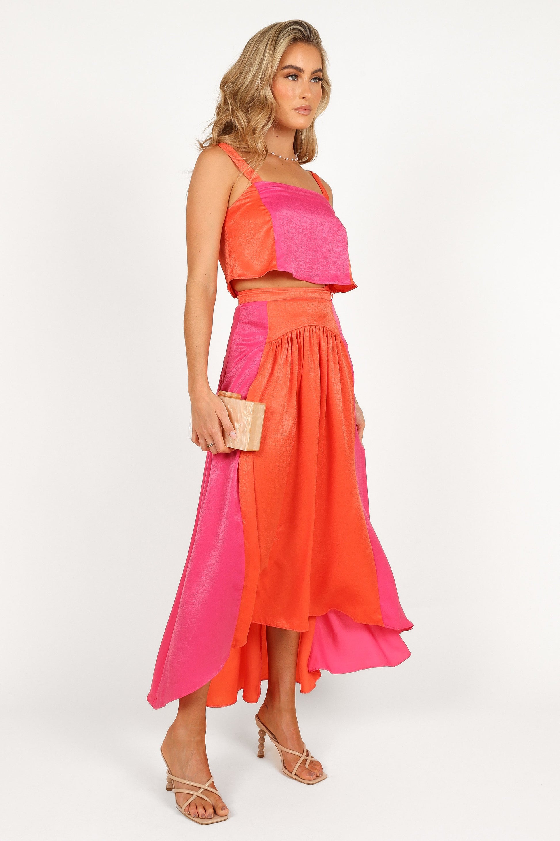 DETAILS Feel your most confident and?feminine in this stylish crop and skirt set. Featuring a cropped length top with non adjustable straps, straight neckline, and side invisible zip for an easy fit. Complete the look with a high-low skirt featuring an elasticised waistband at back, side invisible zip, and oh-so stunning?color block print.