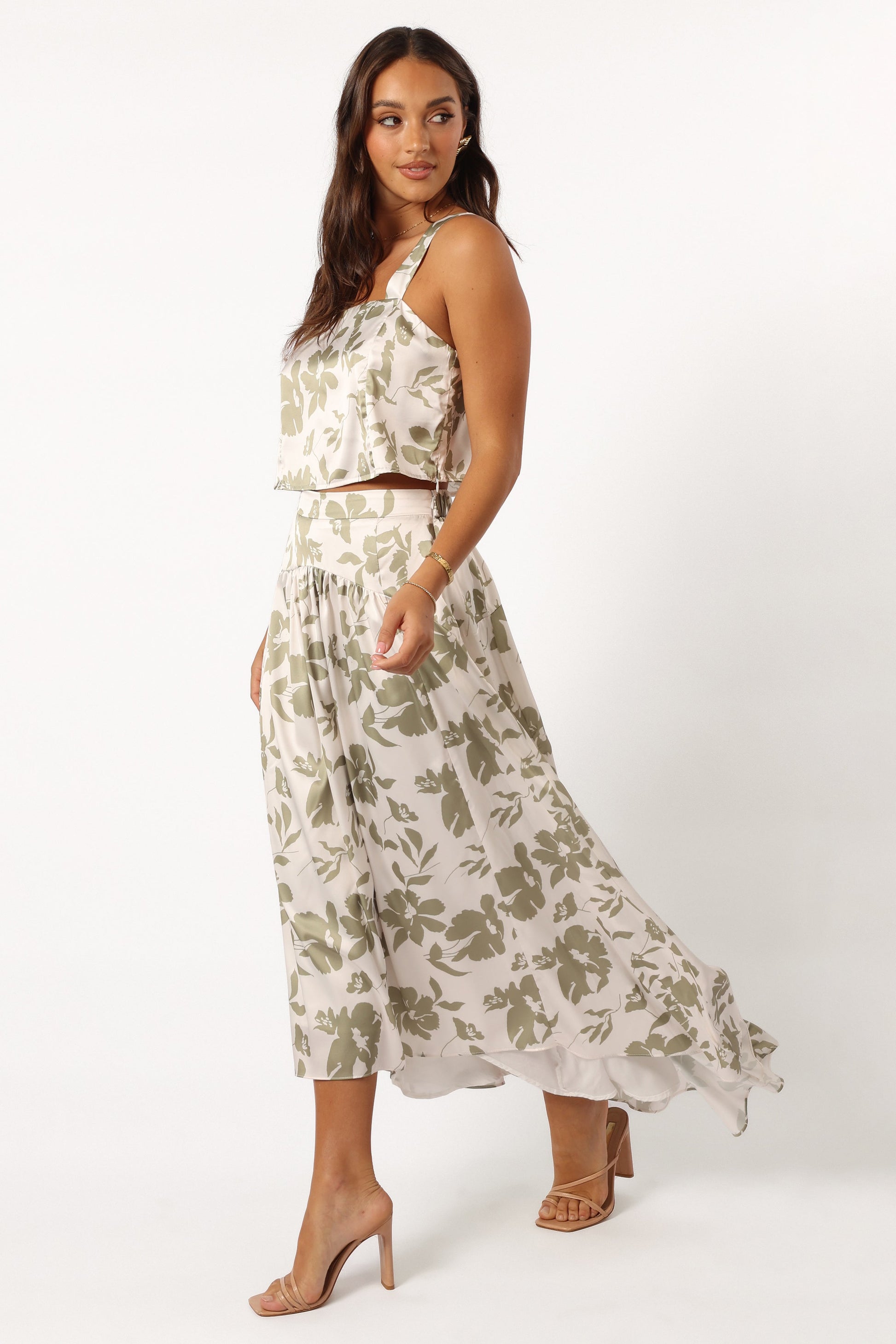 DETAILS Feel your most confident and feminine in this stylish crop and skirt set. Featuring a cropped length top with non adjustable straps, straight neckline, and side invisible zip for an easy fit. Complete the look with a high-low skirt featuring an elasticised waistband at back, side invisible zip, and oh-so stunning color block print.