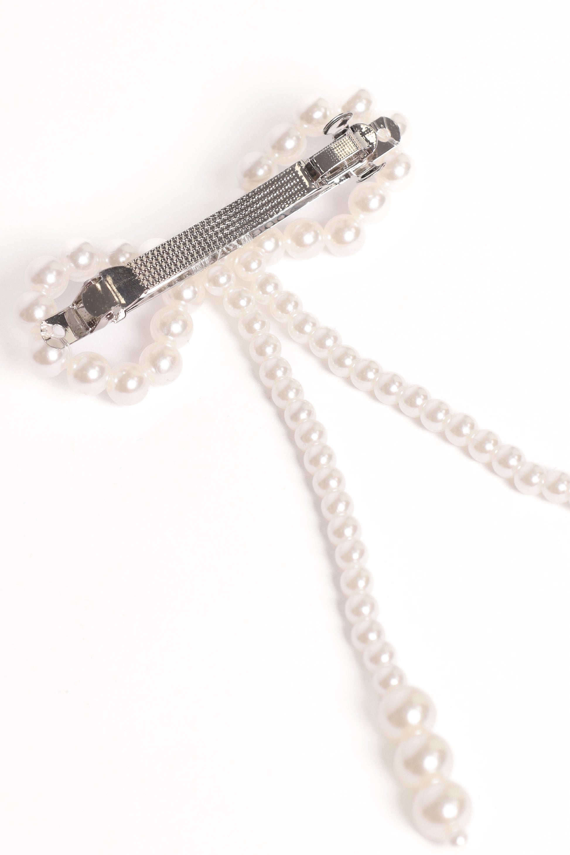 DETAILS Elevate your hairstyle with the Marcella Hair Bow Clip - Pearl, a chic accessory that adds a polished finish to any look. Featuring a classic bow design with elegant faux pearl detailing, this barrette clip is both timeless and trendy.