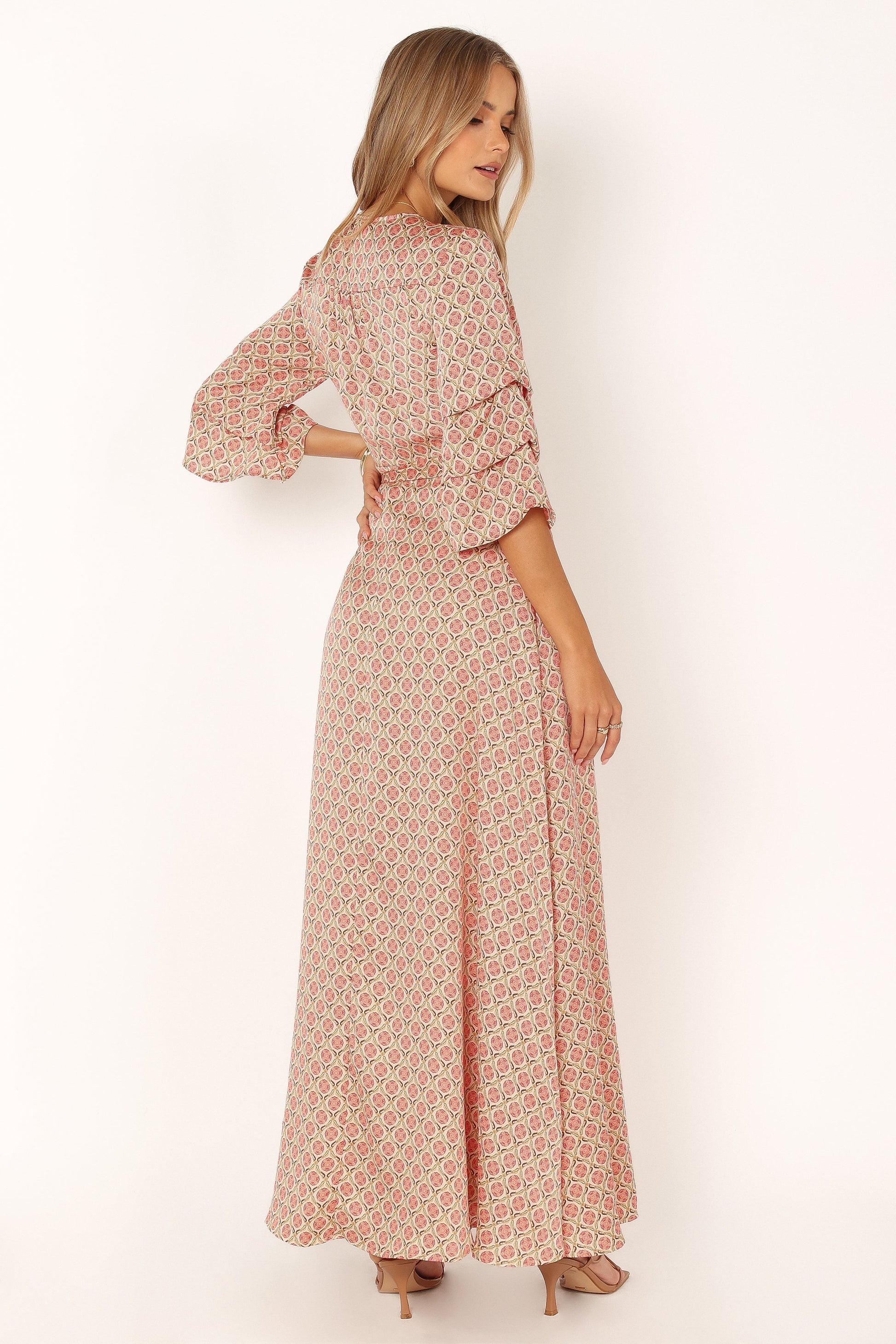 DETAILS Welcome the summer with this stylish maxi dress! Its wrap style and v-overlay neckline create an effortless, relaxed look that you can take from day to night. The mid length sleeves feature a tiered overlay design for an extra touch of unique flair.