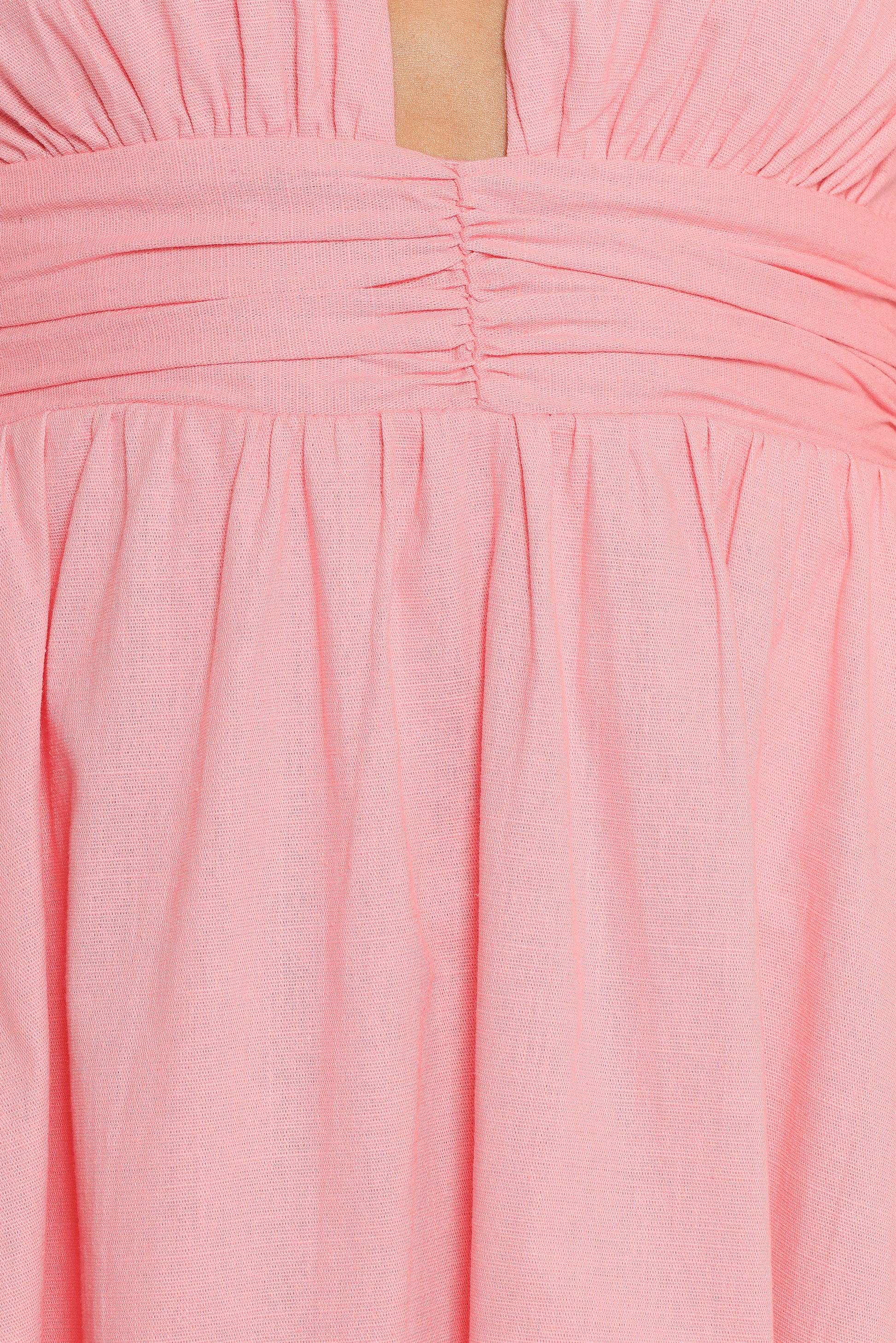 DETAILS The mini-length cut paired with an A-line skirt design creates a flattering silhouette that's as comfortable as it is chic. A V-neckline and short puff sleeves with elasticized cuffs deliver a touch of romantic charm, perfect for balancing casual elegance.