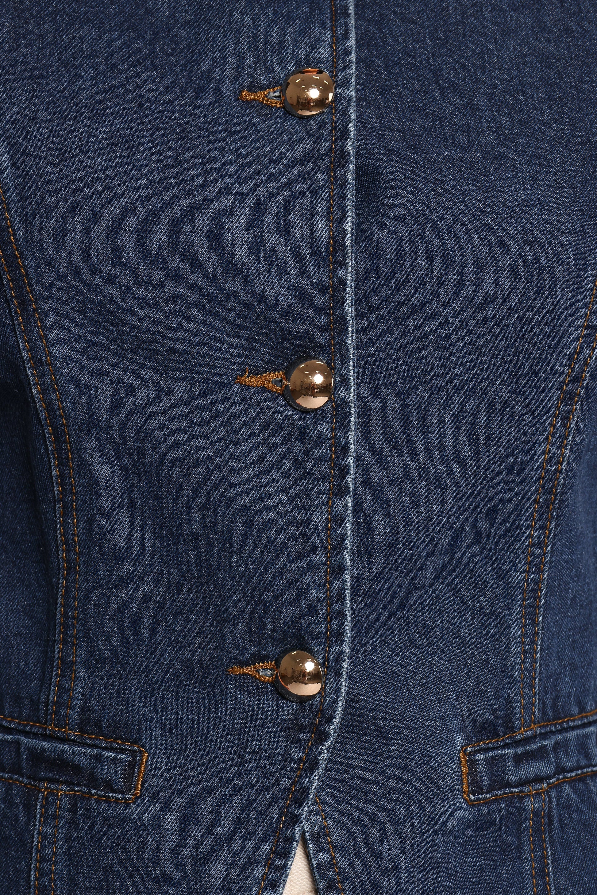 DETAILS Add an effortlessly chic layer to your wardrobe with the Nessa Denim Vest in Blue. This versatile sleeveless piece features a flattering round neckline and functional gold buttons down the front for a crisp, polished finish.