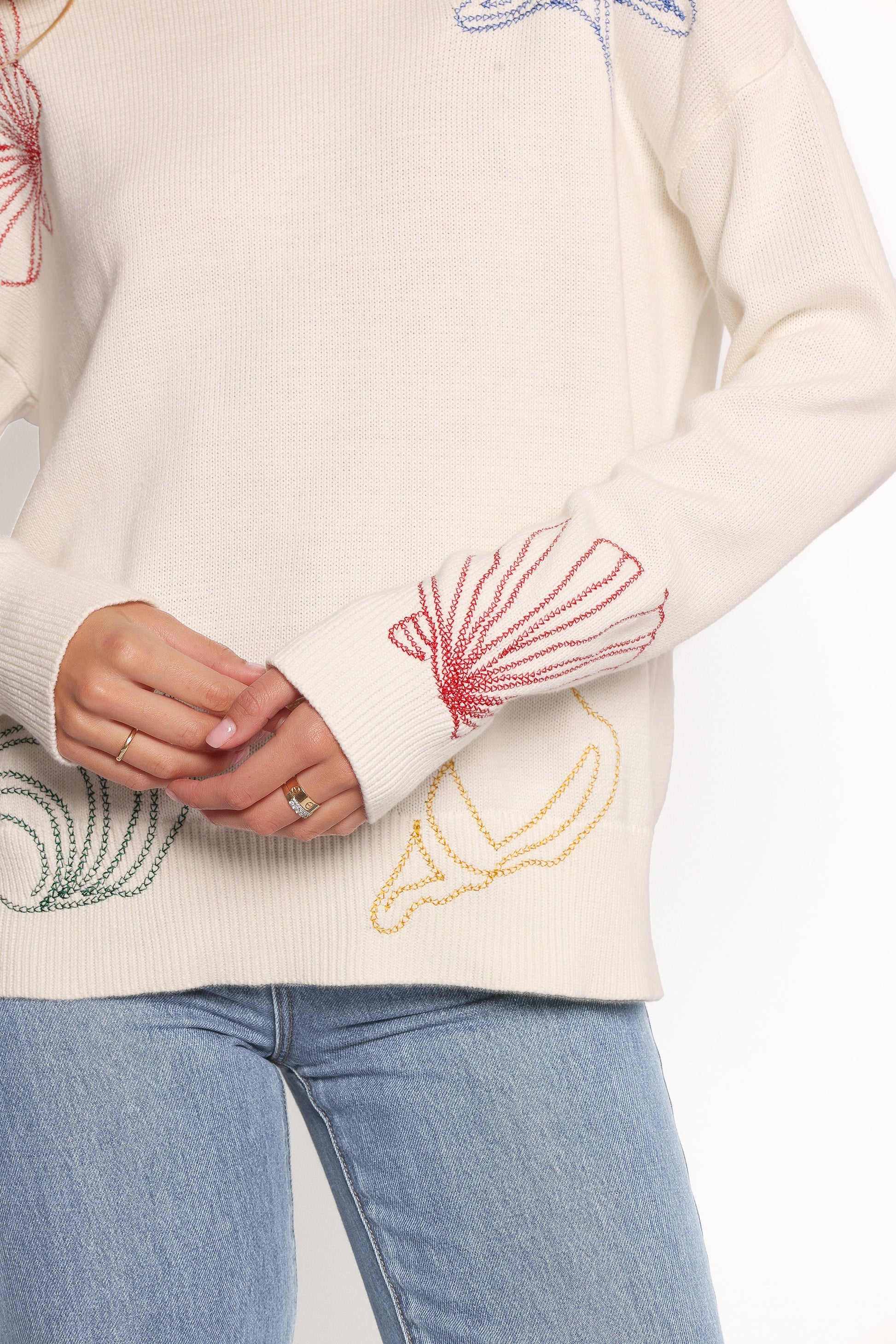 DETAILS Brighten up your wardrobe with the Keegan Flower Knit Sweater in Pink, the perfect blend of comfort and statement style. Featuring a charming seaside-inspired embroidered print, this sweater brings a touch of playful whimsy to your look while keeping you effortlessly cozy.
