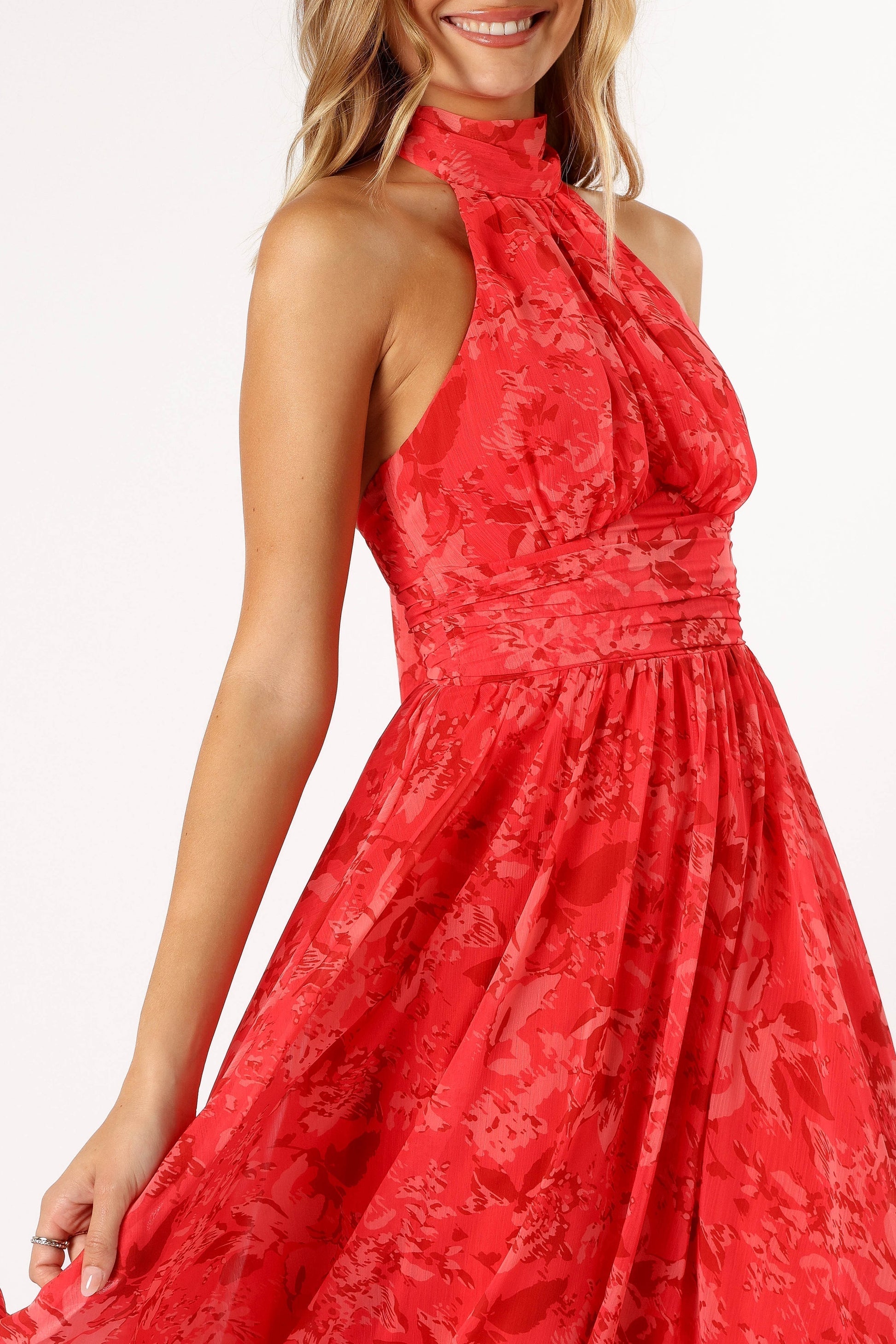 DETAILS Get ready to bloom in our vibrant halterneck dress, featuring an irresistible red floral print. With its playful tie closure and alluring open back, you'll be summer's darling wherever you go. The ruched waistband adds a touch of elegance while making sure the fit is just right.
