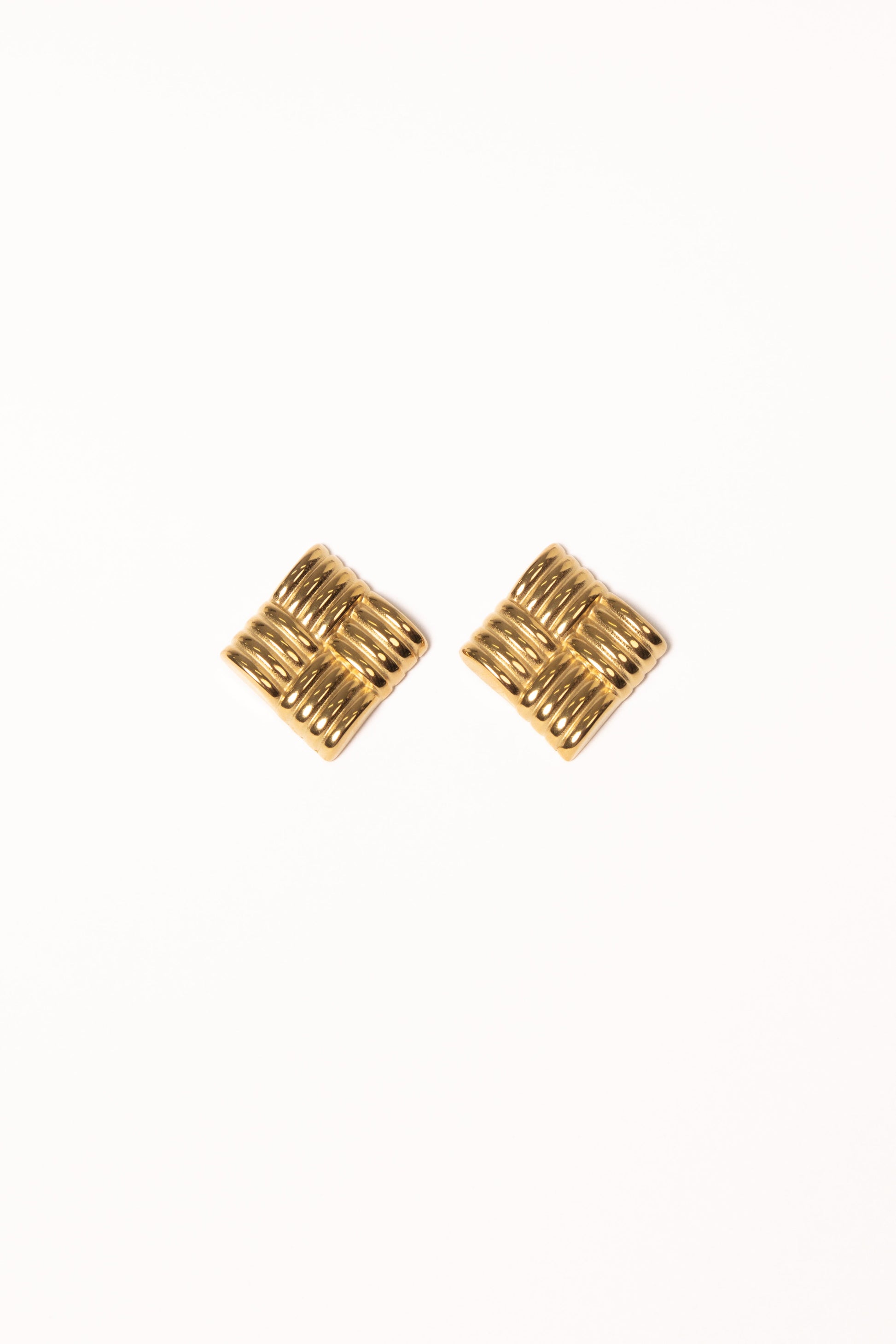 DETAILS Elevate your everyday look with the effortlessly chic Rinna Earrings in Gold. Featuring a bold, large square design with an intricately woven texture, these earrings are a modern twist on a timeless statement piece.