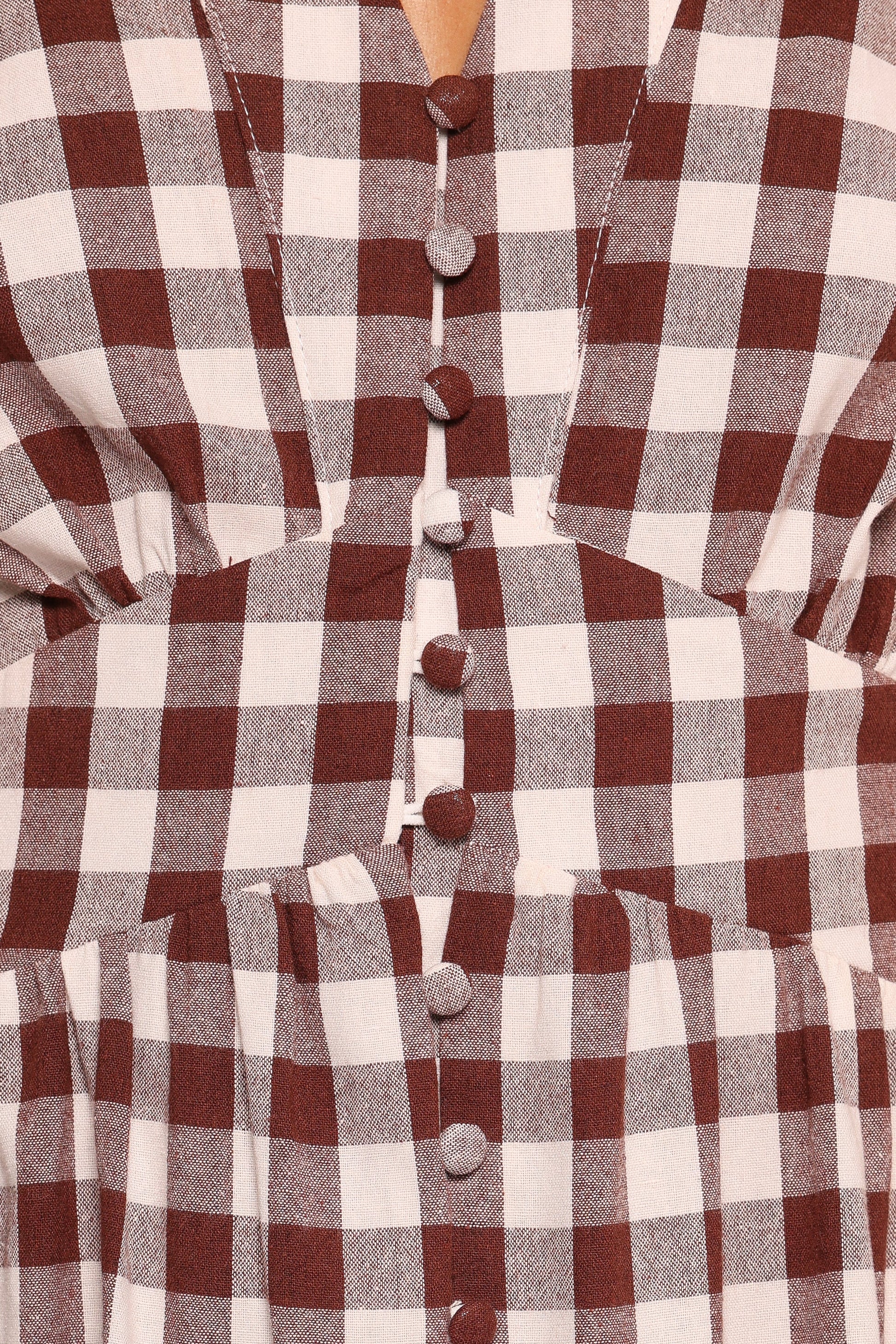 DETAILS Effortless style meets everyday comfort with the Robinson Maxi Dress in brown gingham. This maxi-length dress is designed to flow with grace, featuring a flattering v neckline and short sleeves for an understated yet elegant silhouette.
