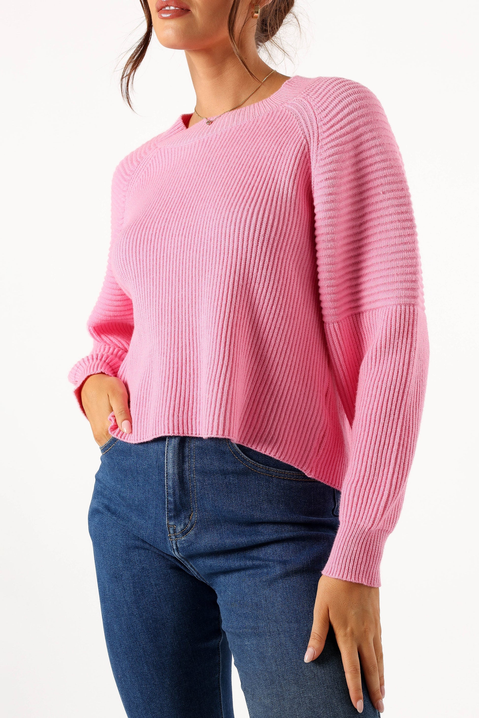 DETAILS Introducing the perfect cropped top for your wardrobe: this pink ribbed knit is a must-have. With a round neckline and long sleeves with ribbed cuffs, it's designed to keep you comfortable all day. The ribbed hem ensures a snug fit while staying stylishly on trend.
