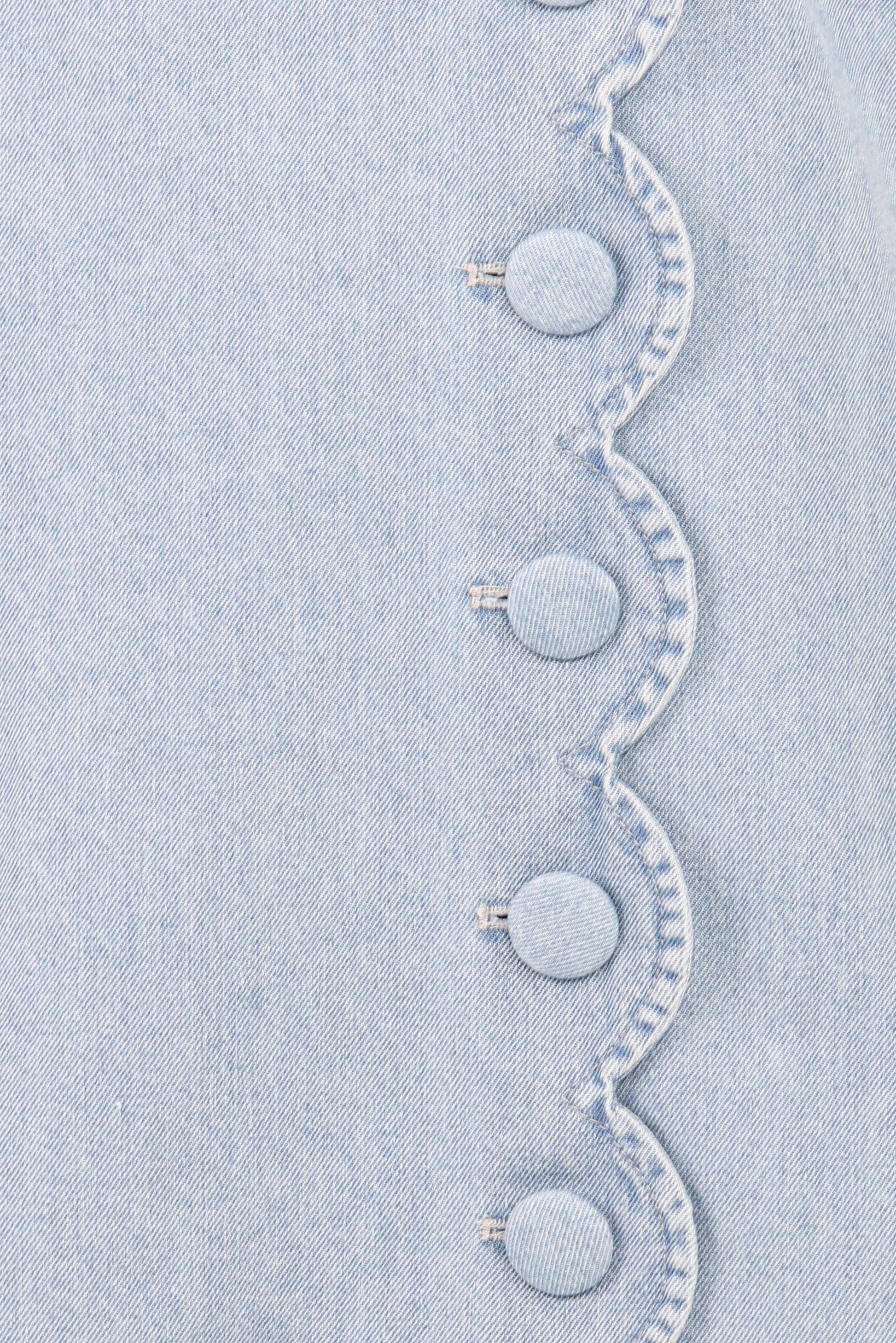 DETAILS The Sloane Mini Dress in light denim is the effortless wardrobe staple you've been searching for. With its clean round neckline and sleeveless silhouette, this piece is designed to keep you cool and comfortable while looking polished.
