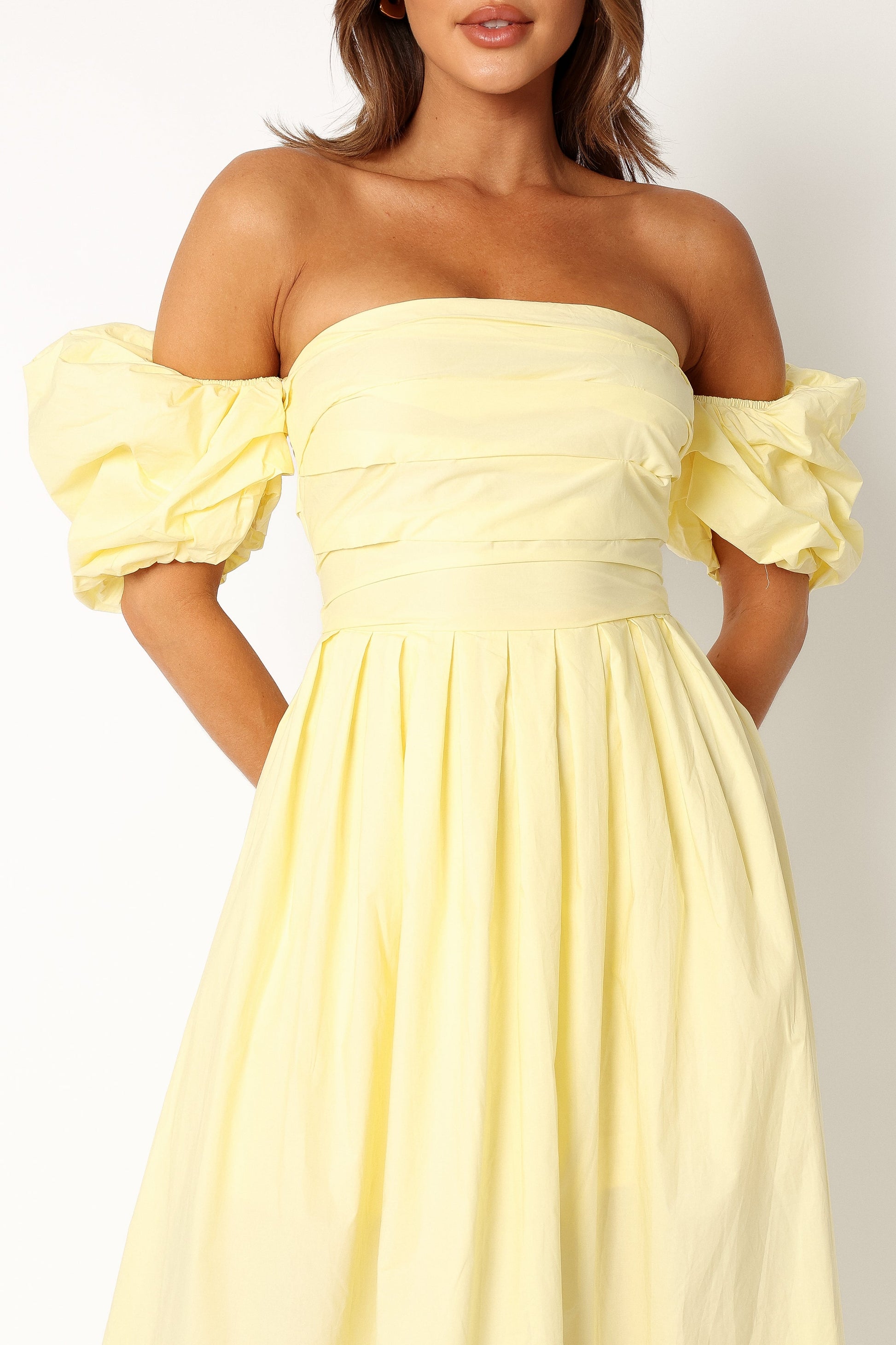 DETAILS The perfect dress for your next party, this off shoulder style dress is a must have for the spring season. Cut to midi-length and with a straight neckline, short elasticised sleeves and gathered pleated detail, it's effortlessly elegant - ideal for special occasions or simply looking good on any day of the week.