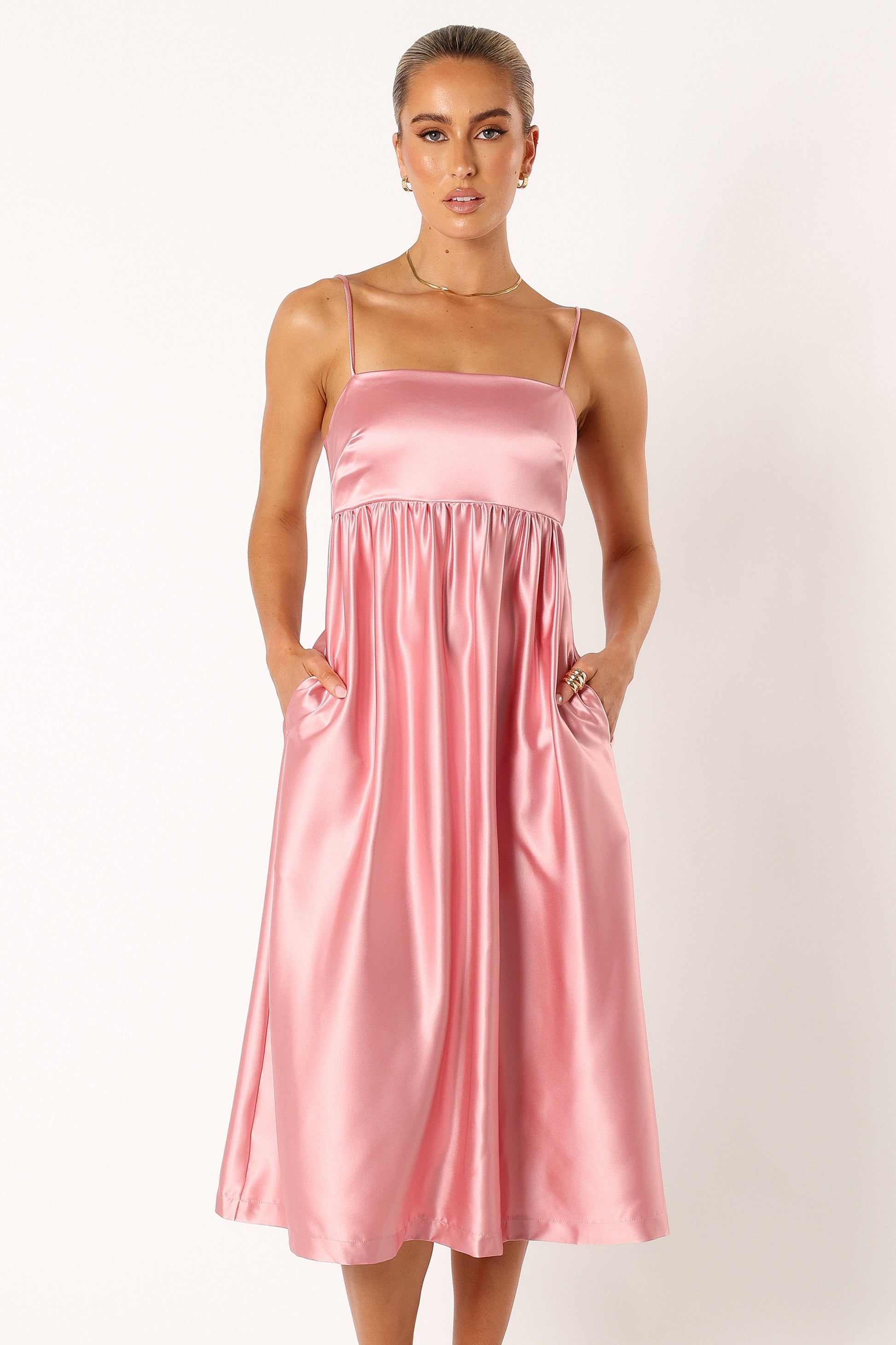 DETAILS This babydoll style dress is complete with a straight neckline and thin adjustable straps for the perfect fit. The back of the dress features an elasticised panel and an adorable bow tie feature for added flair. Plus, functional side pockets make carrying all your essentials a breeze!