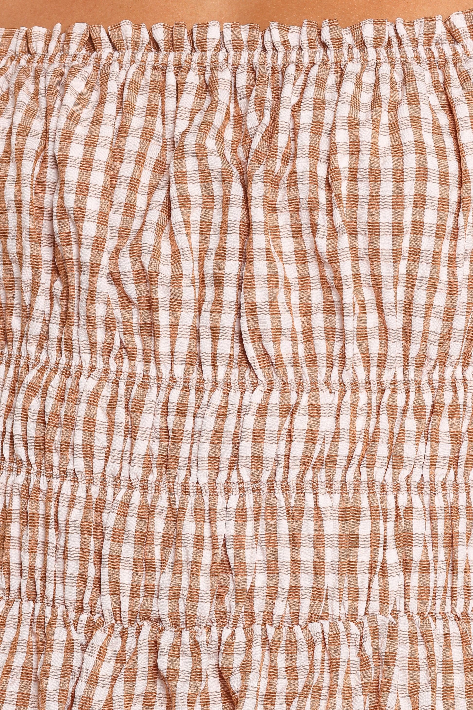 DETAILS This dress combines a classic gingham print with modern design elements to create a truly unique piece. The elasticised square neckline and long sleeves with shirred ruffle cuffs add a touch of elegance, while the elasticised shirred waistband cinches in your silhouette beautifully.