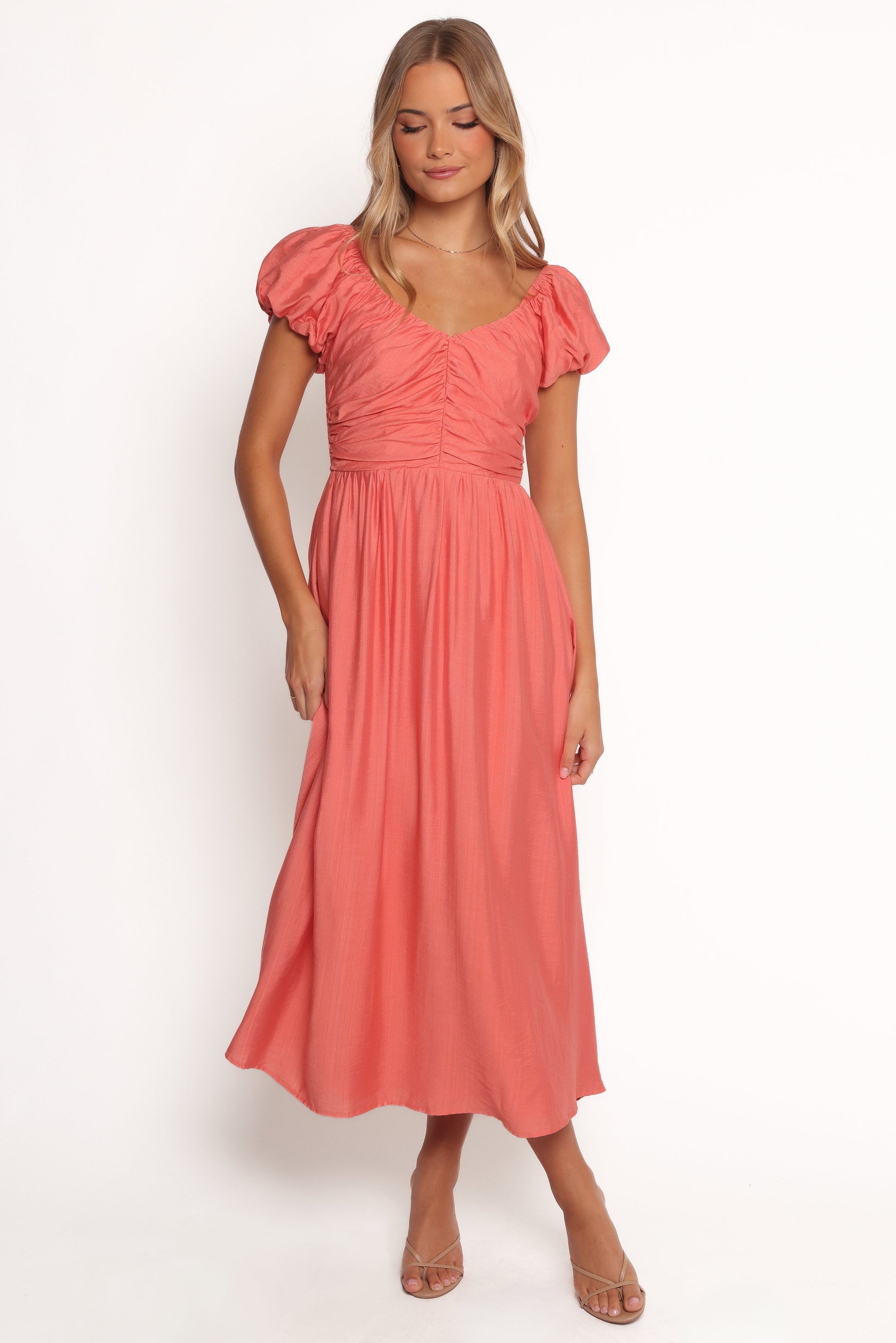 DETAILS Turn heads this season in the Valeen Midi Dress in Coral, a must-have for your wardrobe. Designed with a chic sweetheart neckline and short puff sleeves featuring elasticised cuffs and shoulders, this dress combines comfort and elegance seamlessly.