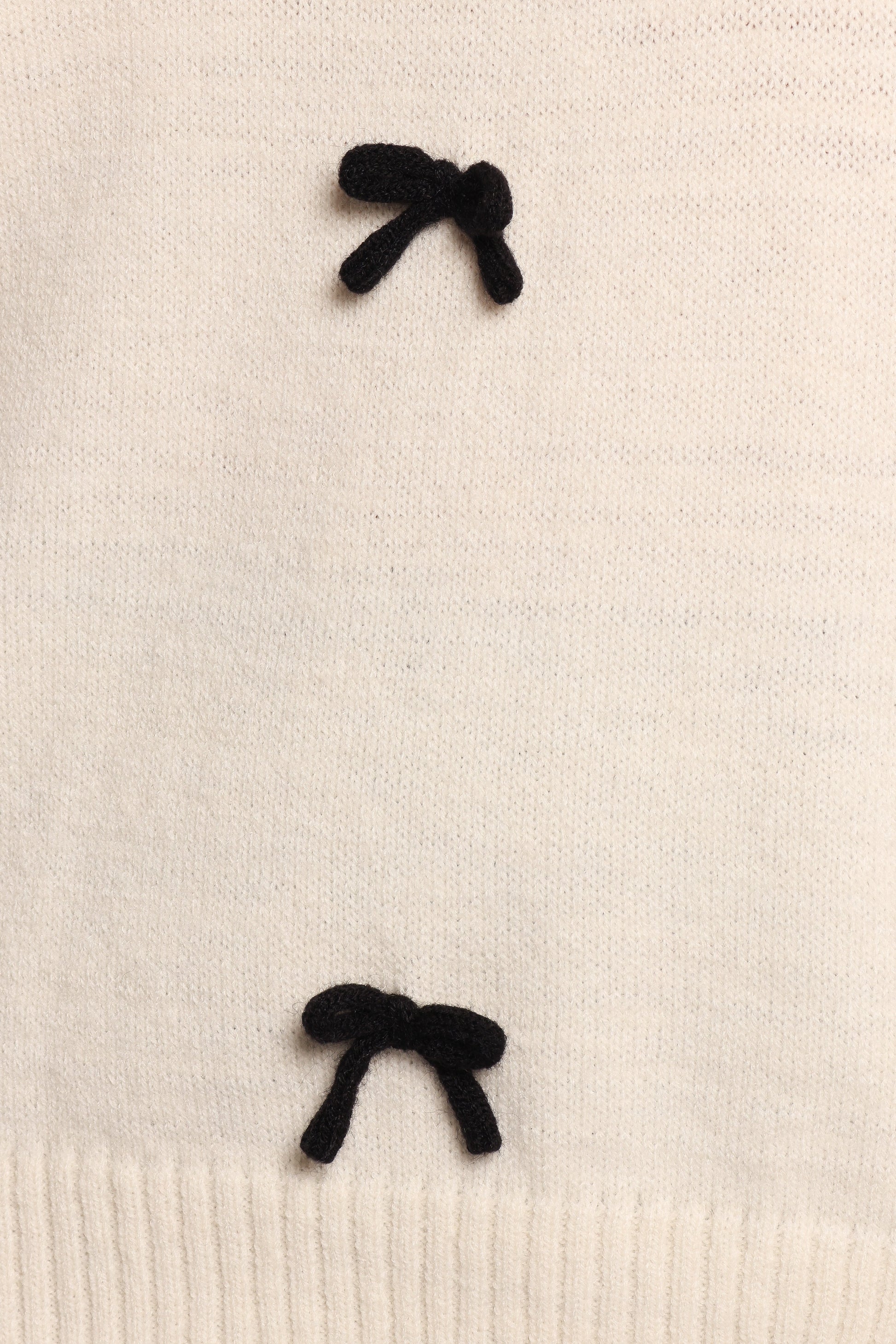 DETAILS Designed with a classic round neckline and long sleeves featuring ribbed cuffs, this sweater strikes the perfect balance between comfort and sophistication. The standout detail? A series of decorative black bows adorn the sleeves, adding a touch of playful elegance that sets this piece apart from your basics.