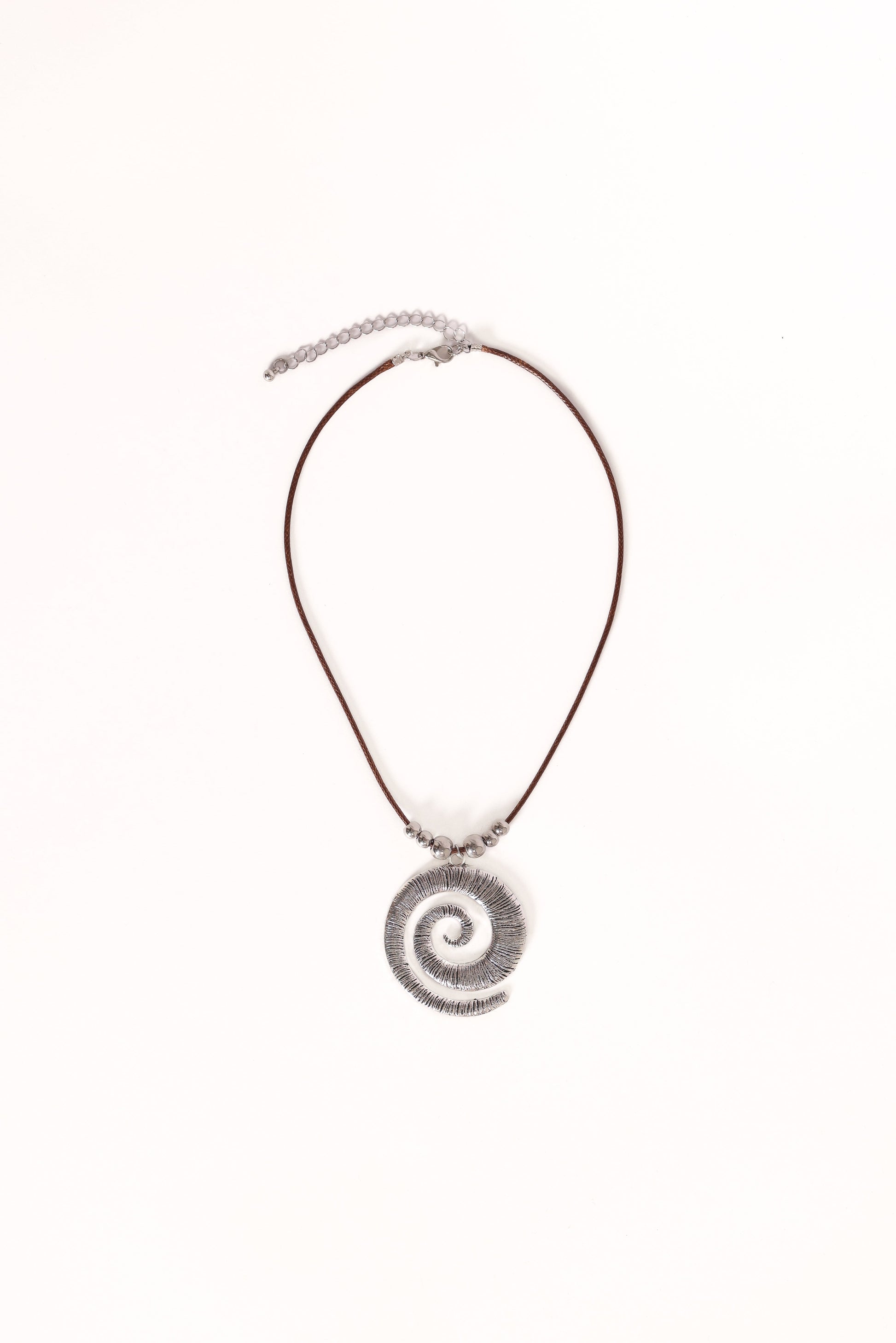 DETAILS Add a touch of effortless elegance to your look with the Whisper Necklace in Silver. Featuring a bold, large silver spiral pendant on a chic brown cord chain, it strikes the perfect balance between modern artistry and timeless design.