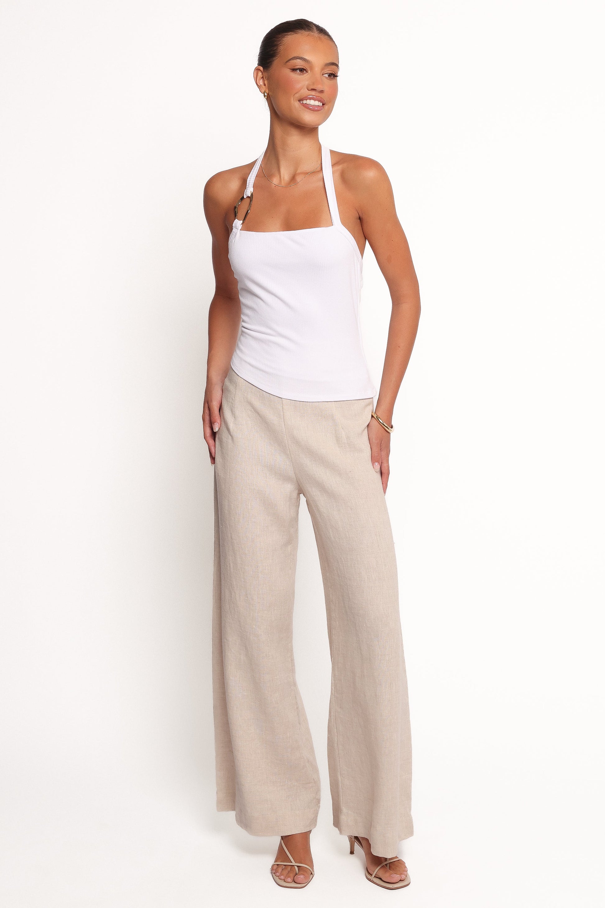 DETAILS Turn heads effortlessly with the Yulissa Halter Knit Top, the perfect blend of modern minimalism and bold accents. Crafted from a stretch ribbed knit that hugs in all the right places, the halter neckline adds a touch of sophistication, while the molten gold ring detail serves as an eye-catching centrepiece, ideal for day-to-night transitions.